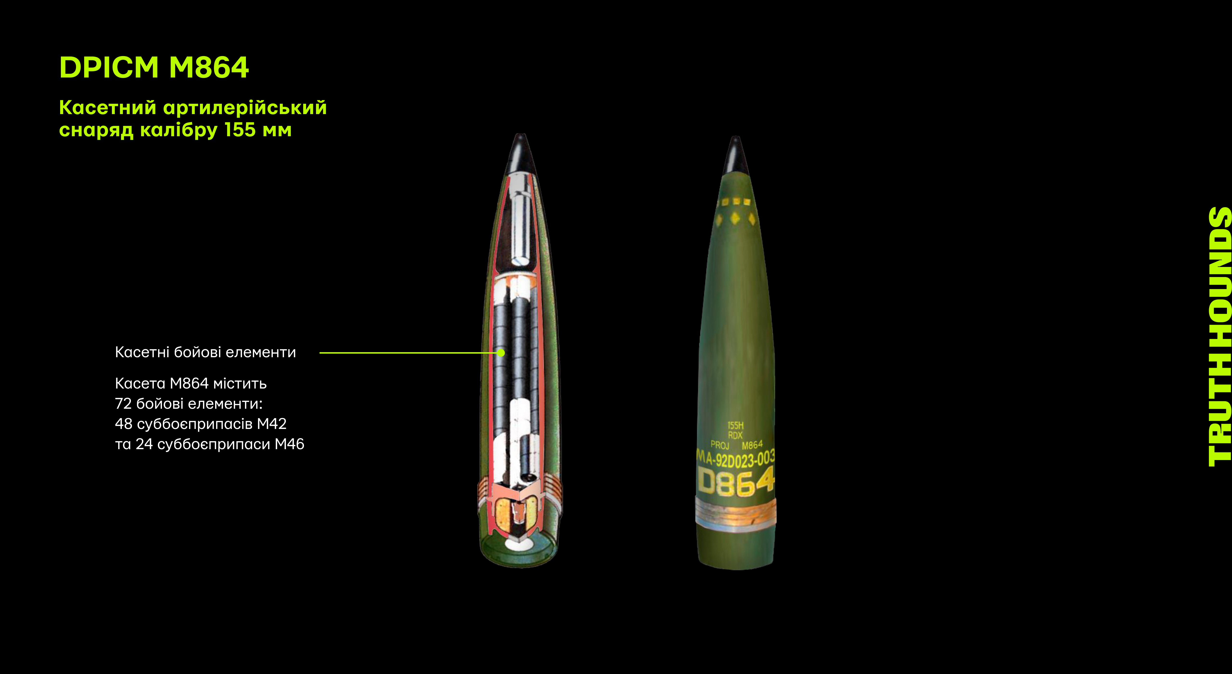 У цьому випадку мова йде про передачу Україні 155-мм касетних снарядів M864. Касета такого снаряда всього містить 72 бойові елементи: 48 суббоєприпасів M42 та 24 суббоєприпаси M46. За інформацією Пентагону, відсоток суббоєприпасів, що не детонують складає всього 2.35%. Водночас у публічному звіті про використання збройними силами США мін під час війни у Перській затоці 2002 року зазначається, що рівень відмови у детонації суббоєприпасів М42 та М46 складає понад 14%.