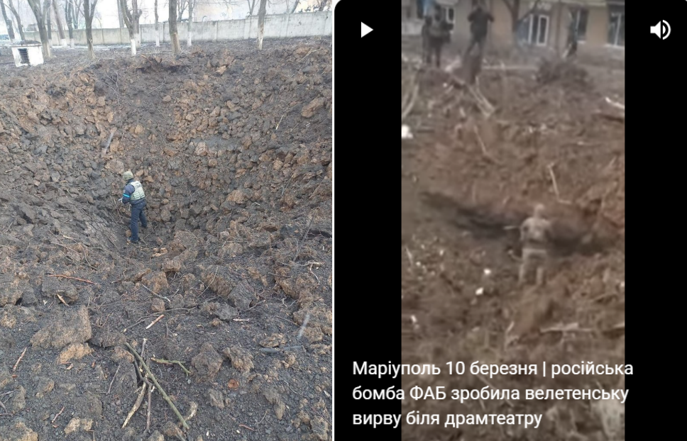 Характер руйнувань та форма вирви після вибуху снаряда в маріупольській лікарні вказують на те, що це була саме авіаційна бомба, як мінімум модифікації ФАБ-500. Для такого типу бомб характерними є кратер вирви правильної форми, глибиною до 8,5 м, максимальний радіус ураження такої бомби для легковразливої техніки становить 110 — 190 м. Усе це ми можемо бачити на відео з місця падіння бомби 9 березня біля пологового будинку в Маріуполі. Цілком очевидним є факт, що технічні характеристики щонайменше 500-кілограмової фугасної авіабомби відповідають загальній картині руйнувань після обстрілу пологового будинку та лікарні.