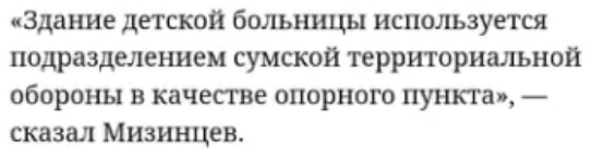 комбатантами. Як вбачається з текстового викладення виступу представника РФ в Радбезі ООН, а також з відеозапису цього виступу, усі «факти» обмежились усними посиланнями на слова місцевих жителів. Слід зазначити, що жодних повідомлень про факт розміщення в приміщенні ані військових ЗСУ, ані представників полку «Азов» у відкритих джерелах (в тому числі в російських пабліках та каналах) не знайдено. Натомість єдиним джерелом, в якому міститься подібна інформація з перших вуст, є репортаж у вищевказаній статті видання Lenta.Ru. Однак, ця стаття, по-перше, з’явилась всього за добу до атаки на пологовий будинок, а по-друге, була опублікована уже після