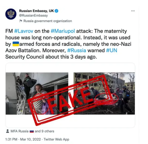 Публікація на офіційній твіттер-сторінці посольства РФ у Великобританії дописів про те, що атака на лікарню та пологовий будинок в Маріуполі — це фейк. Згодом за рішенням компанії Twitter ці дописи було видалено. Одночасно з цим в російських медіа та Instagram-спільноті запускається кампанія з цькування однієї з постраждалих пацієнток, б’ютіблогерки з Маріуполя, Маріанни Підгурської (Вишемірської), якій закидають участь в інсценуванні події.