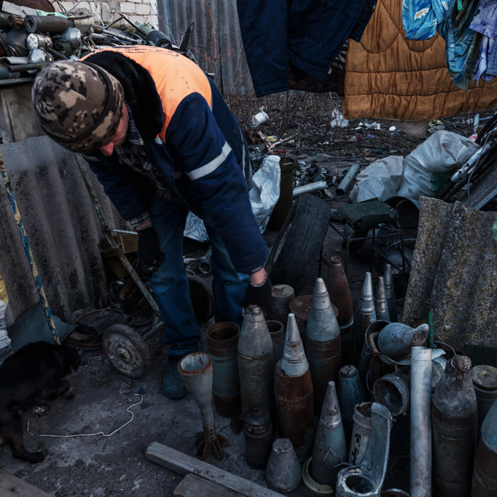 Відредагований війною промисел місцевого мешканця деокупованого села Потьомкине на Херсонщині. Чоловік збирає залишки снарядів, густо розсипаних територією, аби здати їх як брухт.