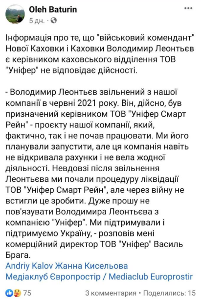 Скриншот зі сторінки Олега Батуріна в Facebook про