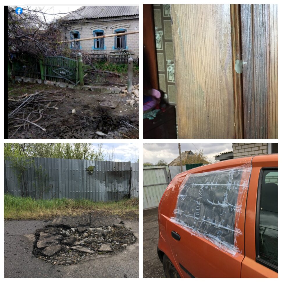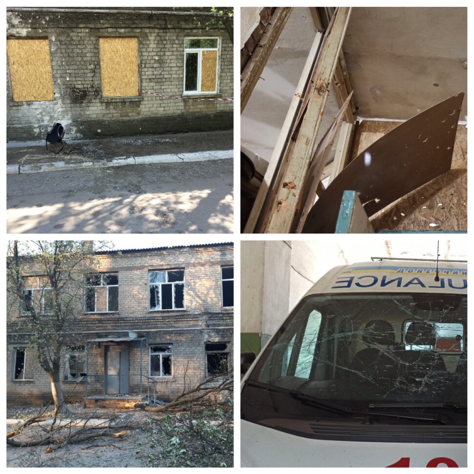 Одразу два цивільних об’єкти сусідніх міст Донеччини — Мар’їнки та Красногорівки — постраждали від артилерійських атак у травні цього року. Спершу пізно ввечері 4 травня було обстріляно районну лікарню, що знаходиться в м. Красногорівка. Розрив снаряду пошкодив західну стіну першого корпусу лікарні і підстанцію швидкої допомоги. В обстріляному корпусі розташовані терапевтичне і кардіологічне відділення, де на момент влучення снаряду перебувало 45 пацієнтів, хворих на COVID-19 та пневмонію. Внаслідок обстрілу в цьому корпусі зникла електроенергія, що поставило під загрозу життя пацієнтів, оскільки апарати ШВЛ (штучної вентиляції легень) працюють виключно від зовнішнього електропостачання [1]. На жаль, один із хворих у COVID-відділенні помер від інфаркту, що стався як наслідок обстрілу [2]. Розриви також вибили вікна, пошкодили зовнішні стіни та внутрішні технічні приміщення станції швидкої допомоги, а також відділення для хворих на COVID-19 та пневмонію (вибиті вікна, пошкоджені зовнішні стіни). Вийшла з ладу і машина швидкої допомоги. Ось що розповідає свідкиня обстрілу: