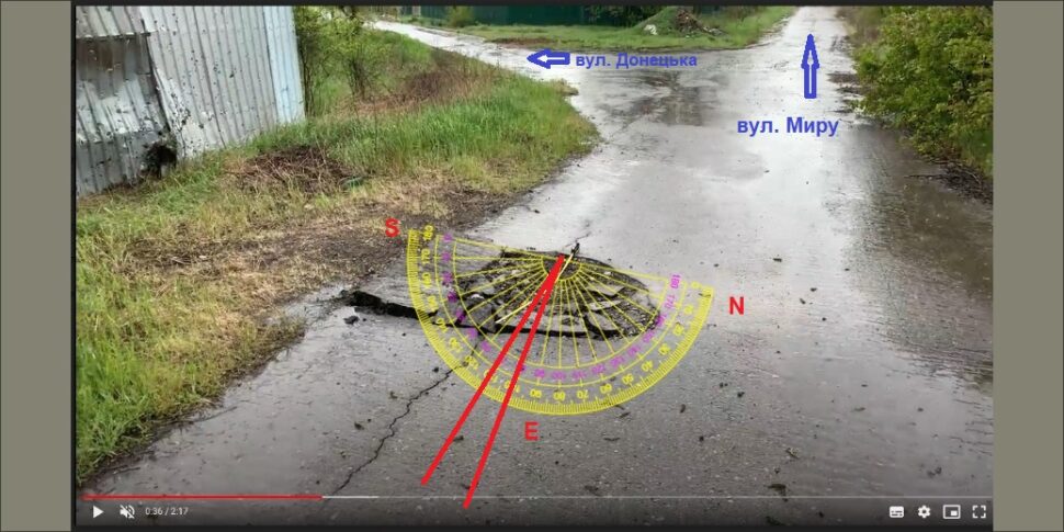 Щодо обстрілу приватного сектору на околицях Мар’їнки 8 травня, то тут для встановлення вогневого напрямку нишпорки задокументували та дослідили вирву, що утворилась на асфальтному покритті, а відтак, мала найбільш чіткий рисунок влучання снаряду і осколочного сліду. Зауважимо, що високих споруд, дерев чи природних утворень поруч з місцем влучання немає. Використавши для аналізу відео, в якому документатори Truth Hounds задокументували положення та форму вирви, можна встановити, що вогонь вівся з південно-східного напрямку (азимут 100-110°).