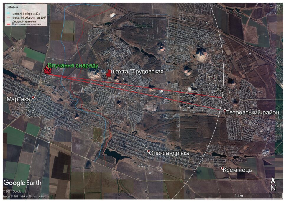 Згідно з цією схемою, можна зробити висновок, що боєприпаси могли бути випущені з південно-східного напрямку, орієнтовний азимут 100-110 градусів, та відповідає направленню “шахта “Трудівська”-Петровський район” м. Донецьк, які перебувають під контролем т.зв.“ДНР”. Орієнтовна відстань до вказаних районів – 5-5,5 км, що відповідає можливостям по дальності стрільби вищевказаної артсистеми “Рапіра” МТ-12. Місця влучання у асфальт на вулиці Миру рівновіддалені від позицій ЗСУ, що знаходяться біля вентиляційного виходу з шахти “Трудівська” та на території колишньої лікарні м. Мар’їнка, приблизно на 650 м. Відстань до позицій т.зв.“ДНР” – приблизно 2 км. Важливий момент: в кінці вулиці Миру знаходяться позиції ЗСУ (220 метрів від крайнього розриву). Про це свідчать місцеві жителі. Позиції також помітно на супутникових знімках. Однак ті ж місцеві стверджують, що звідти не стріляють й позиції чисто оборонного характеру.