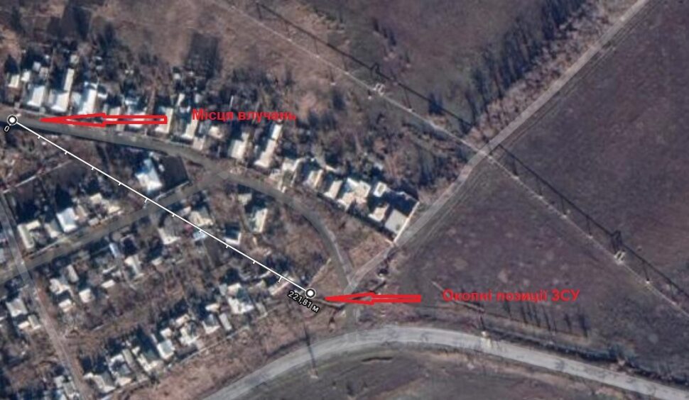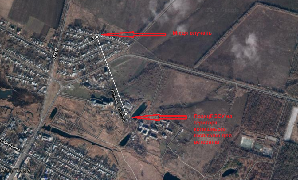 Якщо накласти азимут на мапу, доповнивши схему зоною граничного враження артилерійською системою САУ 2С1 «Гвоздика», з якої, ймовірно, вівся обстріл лікарні, то вимальовується такий сектор вогневого ураження: