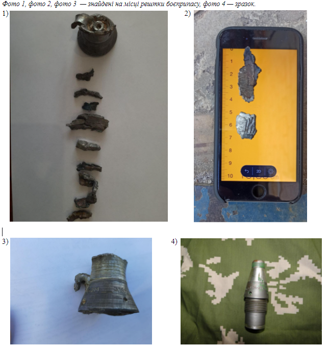 На підставі зібраних фрагментів і фото, оприлюднених прес-службою 28 ОМБр імені Лицарів Зимового Походу [3], документатори встановили, що в разі з обстрілом лікарні в Красногорівці використовувались снаряди артилерійських систем калібрів 122мм та 152мм. На фото (3) зображені рештки, які мають певну схожість з підривником РГМ-2М (4) від цих снарядів.