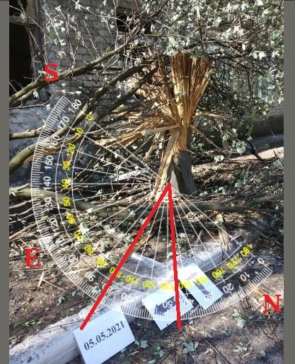 Так, у випадку з обстрілом лікарні в Красногорівці снаряд розірвався, здетонувавши об дерево, тому розліт осколків не давав чіткої картини напрямку ведення вогню. На відео та фото, знятих докуметаторами Truth Hounds видно, що осколочні сліди однакової кучності та напрямку розташовані рівномірно з усіх сторін від ймовірної точки підриву снаряду. Однак судячи з характеру пошкоджень дерева, західна частина стовбуру якого залишилась цілішою, можна зробити висновок, що снаряд прилетів зі східного боку. В 2-х метрах на південь від дерева стіна лікарні висотою не менше 12-ти метрів, тому напрямок на південь як місце запуску можна виключити. Враховуючи розташування дерева, будівлі і характер слідів розриву, можна визначити амплітуду азимуту ведення вогню.