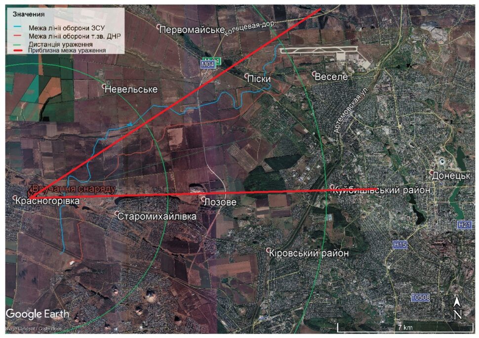 Як бачимо, боєприпас міг бути випущений з північно-східного напрямку, орієнтовний азимут 45-80 градусів, та відповідає направленню на селище Веселе та забудови мікрорайону “Жовтневий” Куйбишевського району м. Донецьк, які перебувають під контролем т.зв.“ДНР”. Орієнтовна відстань до вказаних районів – 15 км, що відповідає можливостям по дальності стрільби вищевказаних артсистем: 122мм-САУ 2С1 «Гвоздика» та 122-мм буксирувана гаубиця Д-30. Місце влучання в лікарню розташоване на відстані приблизно 1,7 км від найближчих бойових позицій ЗСУ. Відстань до позицій т.зв.“ДНР” – приблизно 2,5 км.