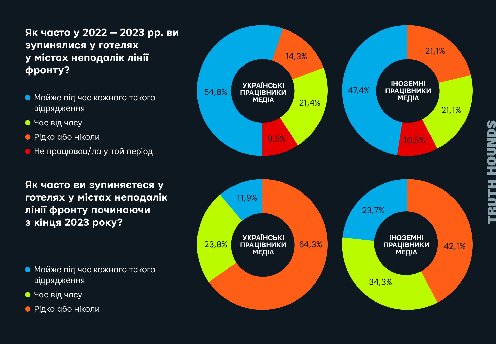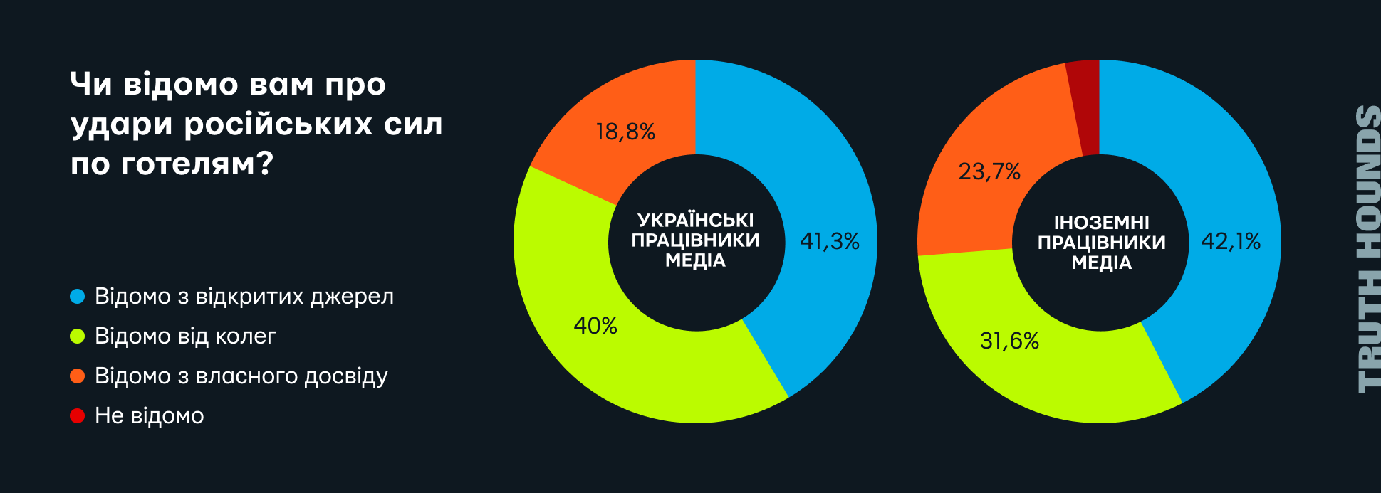 Задля дослідження ширших наслідків цих нападів для працівників медіа було проведено онлайн-опитування серед журналістів та інших медійників, які висвітлюють збройний конфлікт в Україні[10]. Метою опитування було оцінити вплив російських атак на готелі на професійну діяльність медійників, зокрема в контексті безпекових міркувань, психологічного тиску та операційних обмежень. Опитування проводилося українською та англійською мовами й залишалося відкритим для відповідей у період з 29 січня по 14 березня 2025 року. Згодом його було поширено українськими організаціями — Інститутом масової інформації[11], Львівським медіафорумом[12], а також Media Development Foundation[13]. Крім того, опитування розповсюджувалося через глобальну мережу «Репортери без кордонів» (RSF).
