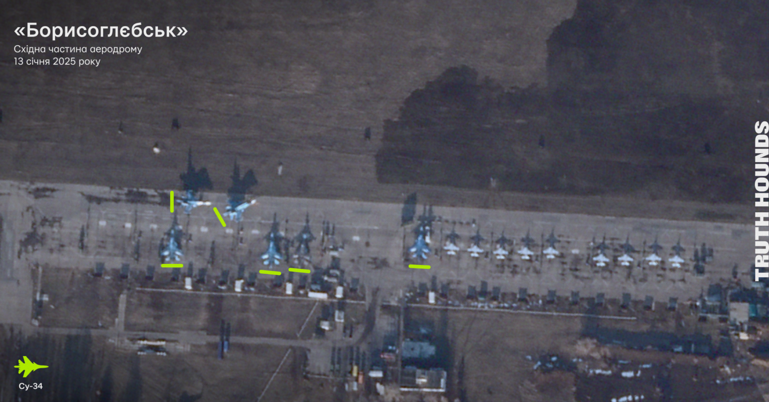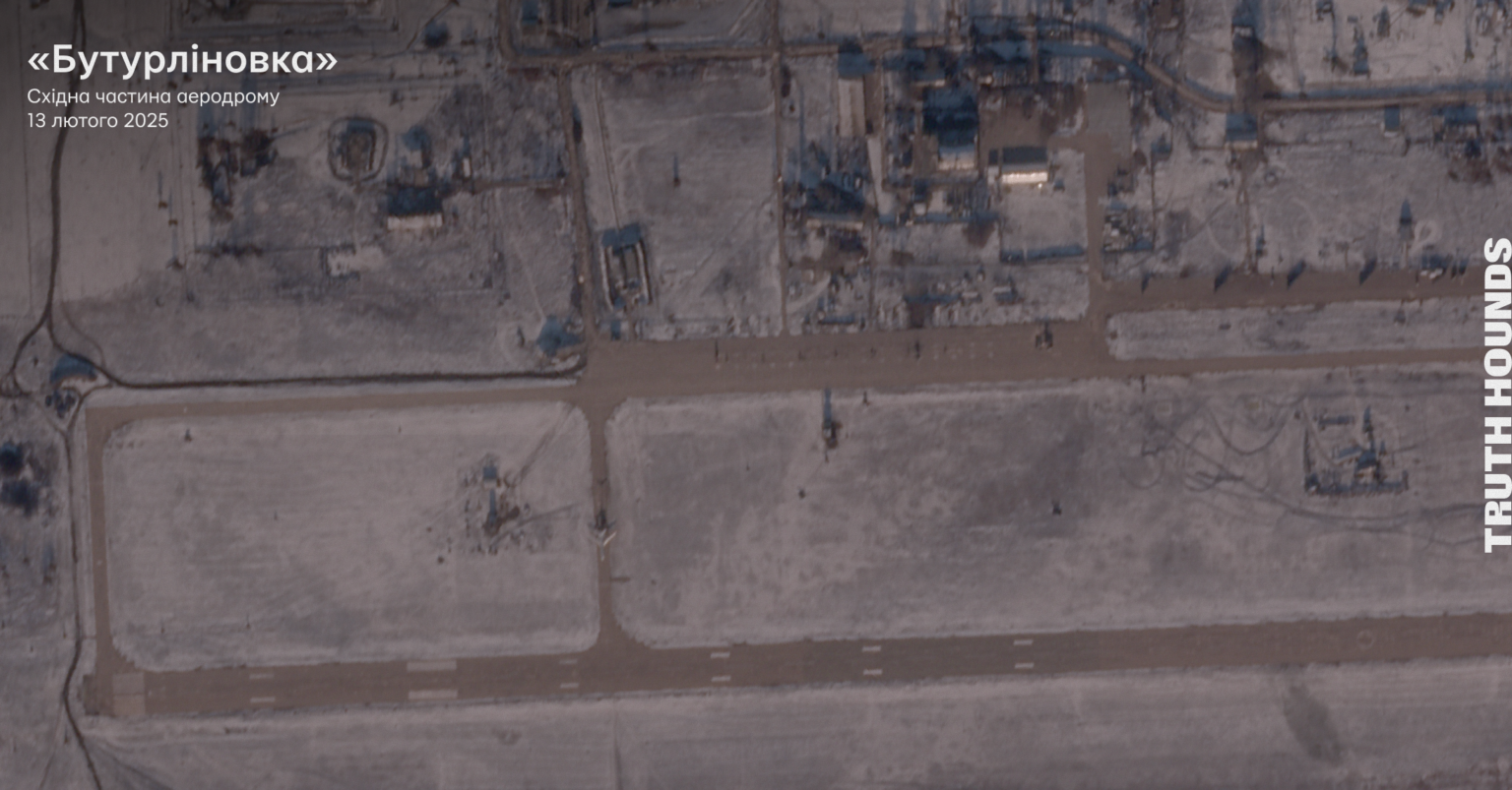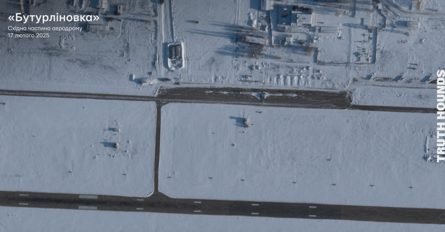 - Команда Truth Hounds проаналізувала високоякісні знімки аеродрому «Бутурліновка» від 13 січня 2025 та 17 лютого 2025 року. Також були проаналізовані низькоякісні знімки супутника Sentinel-2 від 22 січня 2025 року та 8 лютого 2025 року. На всіх супутникових знімках немає активності бомбардувальників Су-34.
