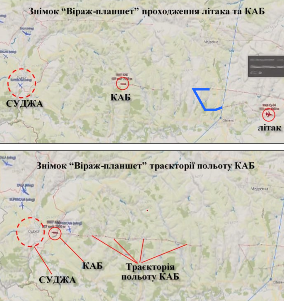 Розслідувачі Truth Hounds не знайшли фактів бойової роботи авіації Сил оборони України поблизу Суджі. Водночас російська авіація почала підтверджено бити по Суджі ФАБ з УМПК уже з 06 січня 2025 року[79] — тоді російські мілітарні канали самі повідомили про це[80]. На наступний день після атаки Повітряні Сили ЗСУ опублікували знімки екрана із застосунку «Віраж-планшет», автоматизованої системи збору інформації про повітряну обстановку[81]. Знімки вказують на те, що це Росія застосувала авіаційне озброєння зі східної сторони від Суджі[82], а саме — літак Су-34, який запустив ФАБ з УМПК. Російська ж офіційна сторона жодних матеріалів для підтвердження завдавання удару не оприлюднила. Отже, найімовірніше, удар здійснили з використанням авіаційного озброєння Російської Федерації.