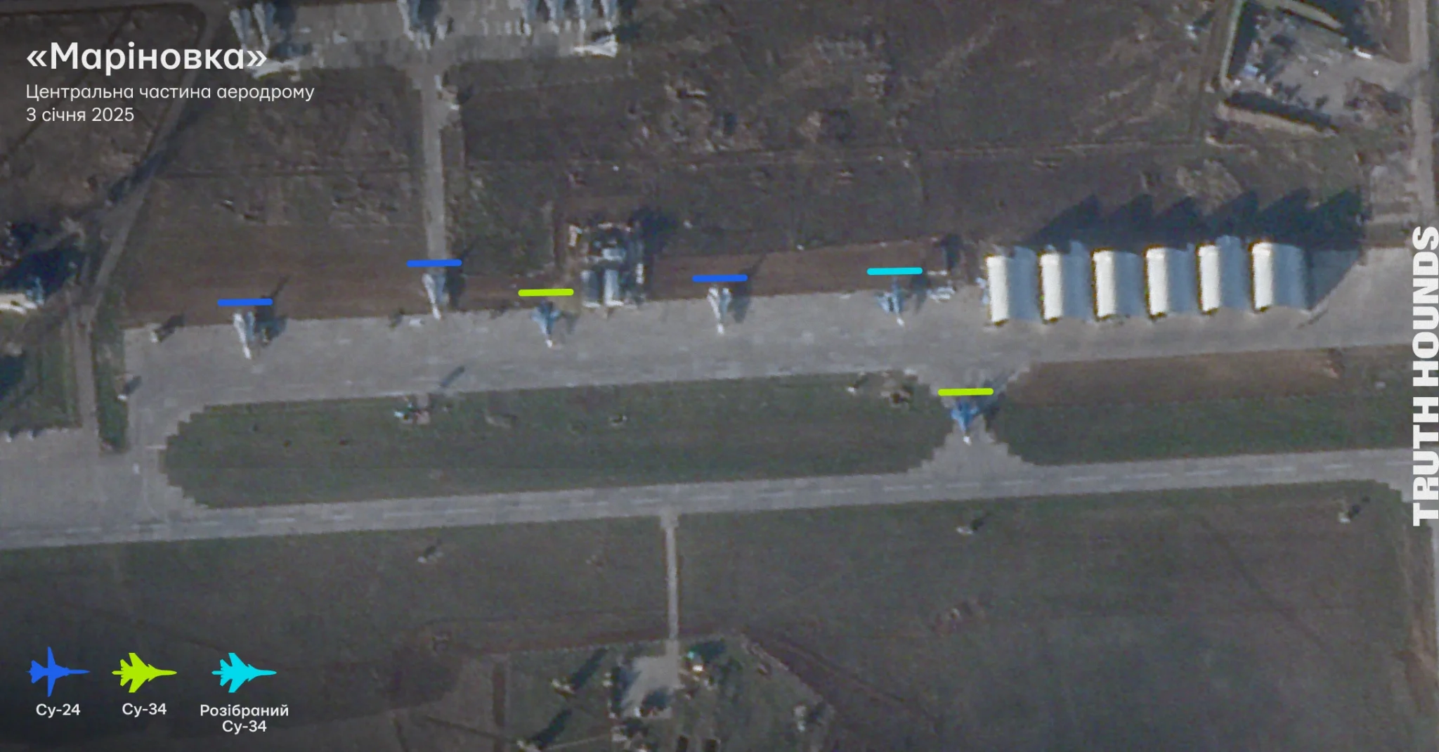 - Детальний розбір аеродромів «Маріновка» та «Морозовськ» можна побачити в розділі V. Атаки на цивільну інфраструктуру керованими авіаційними бомбами у Херсоні — розслідування «Керований Хаос». Truth Hounds (2024). Керований хаос: як російські авіабомби знищують цивільних та інфраструктуру. URL: https://dev.truth-hounds.org/cases/kerovanyj-haos/ (дата звернення: 25.01.2026).