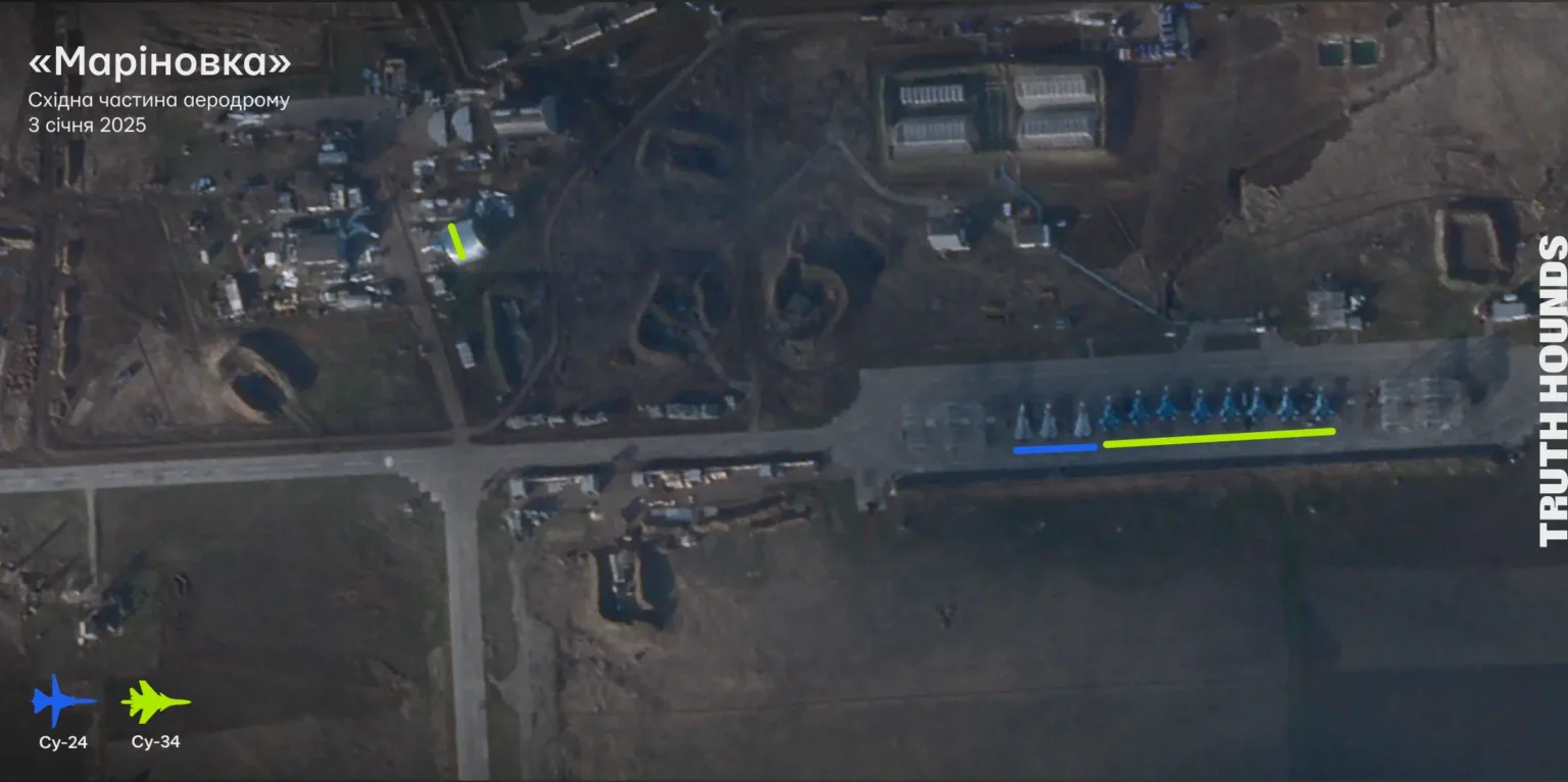 На супутниковому знімку східної частини аеродрому «Маріновка» видно щонайменше дев’ять Су-34 та три Су-24.