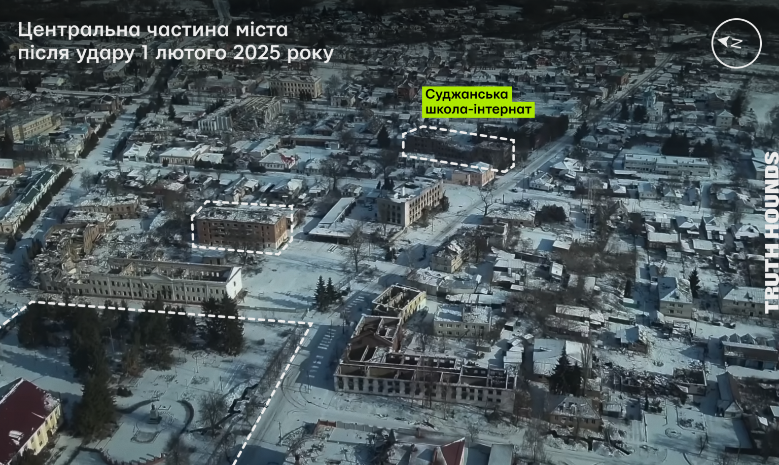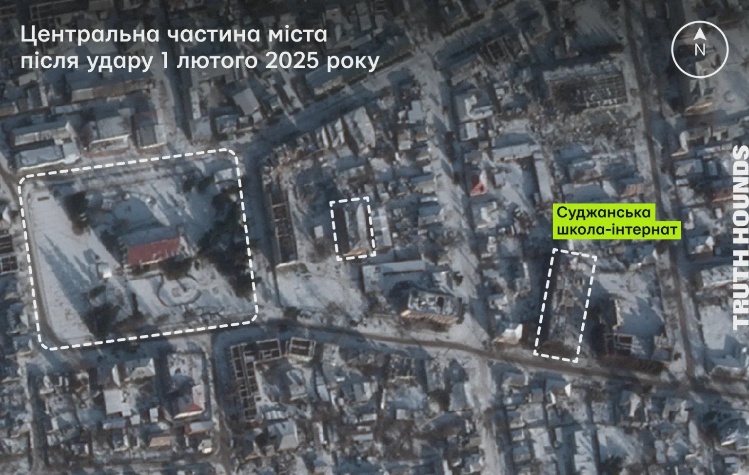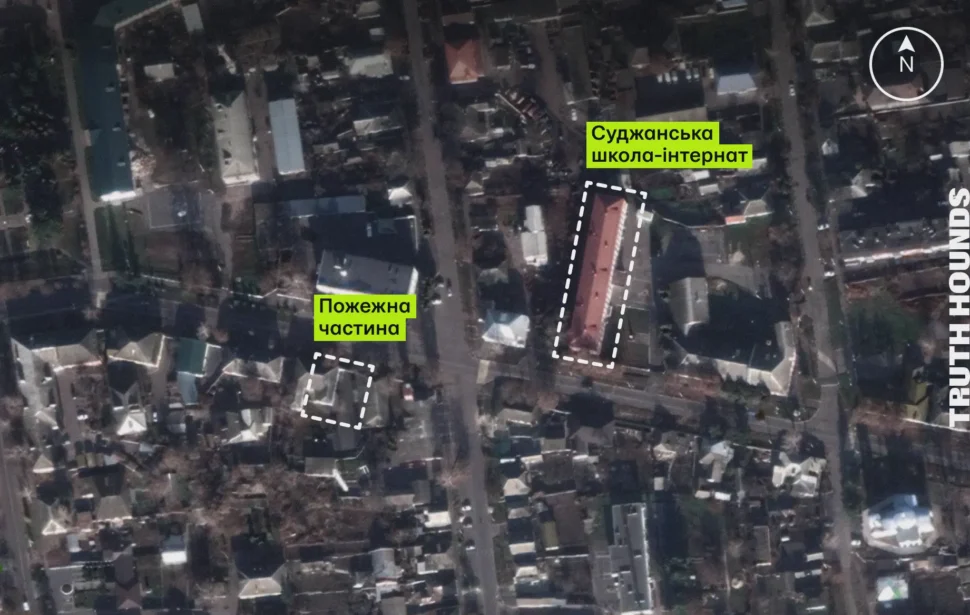 На знімку можна побачити зруйновану Суджанську школу-інтернат після влучання (справа) та інші будівлі, що дають змогу ідентифікувати місцевість (зліва та по центру).