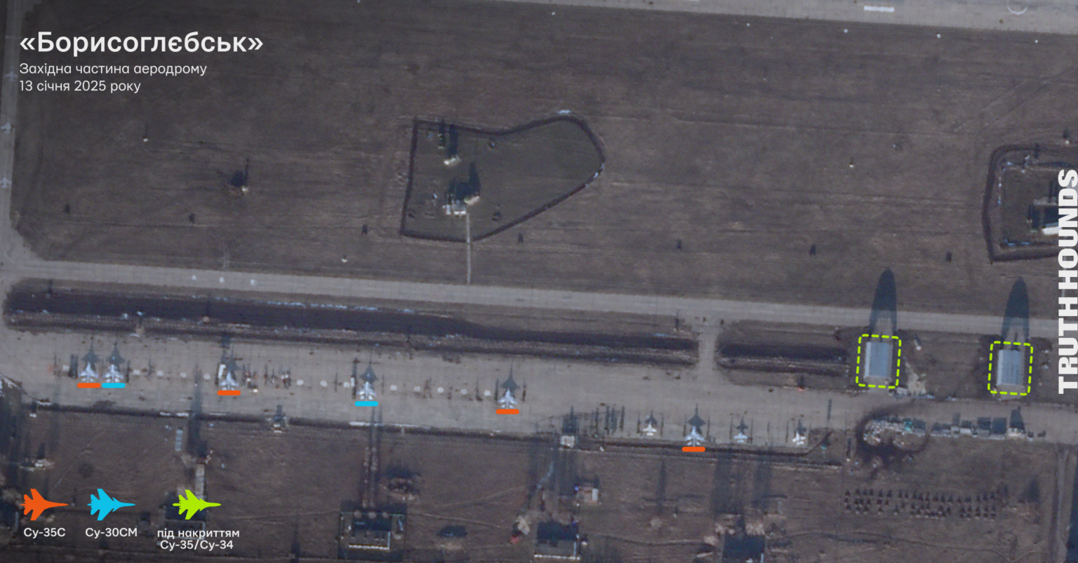 На супутниковому знімку західної частини аеродрому «Борисоглєбськ» видно щонайменше чотири Су-35С та два Су-30СМ. Також під накриттям стоїть два літаки Су-35/Су-34.