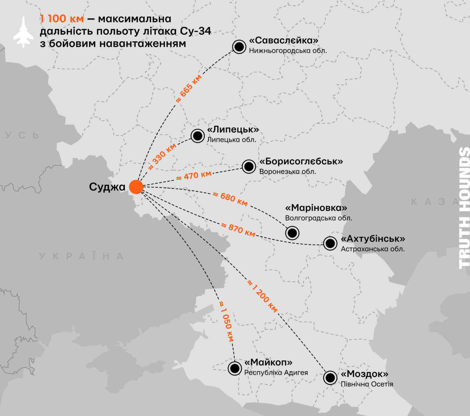 Розглянемо їх детальніше, щоб зрозуміти, з якого саме аеродрому Су-34 прилетів на Бутурліновку для атаки на місто Суджа.