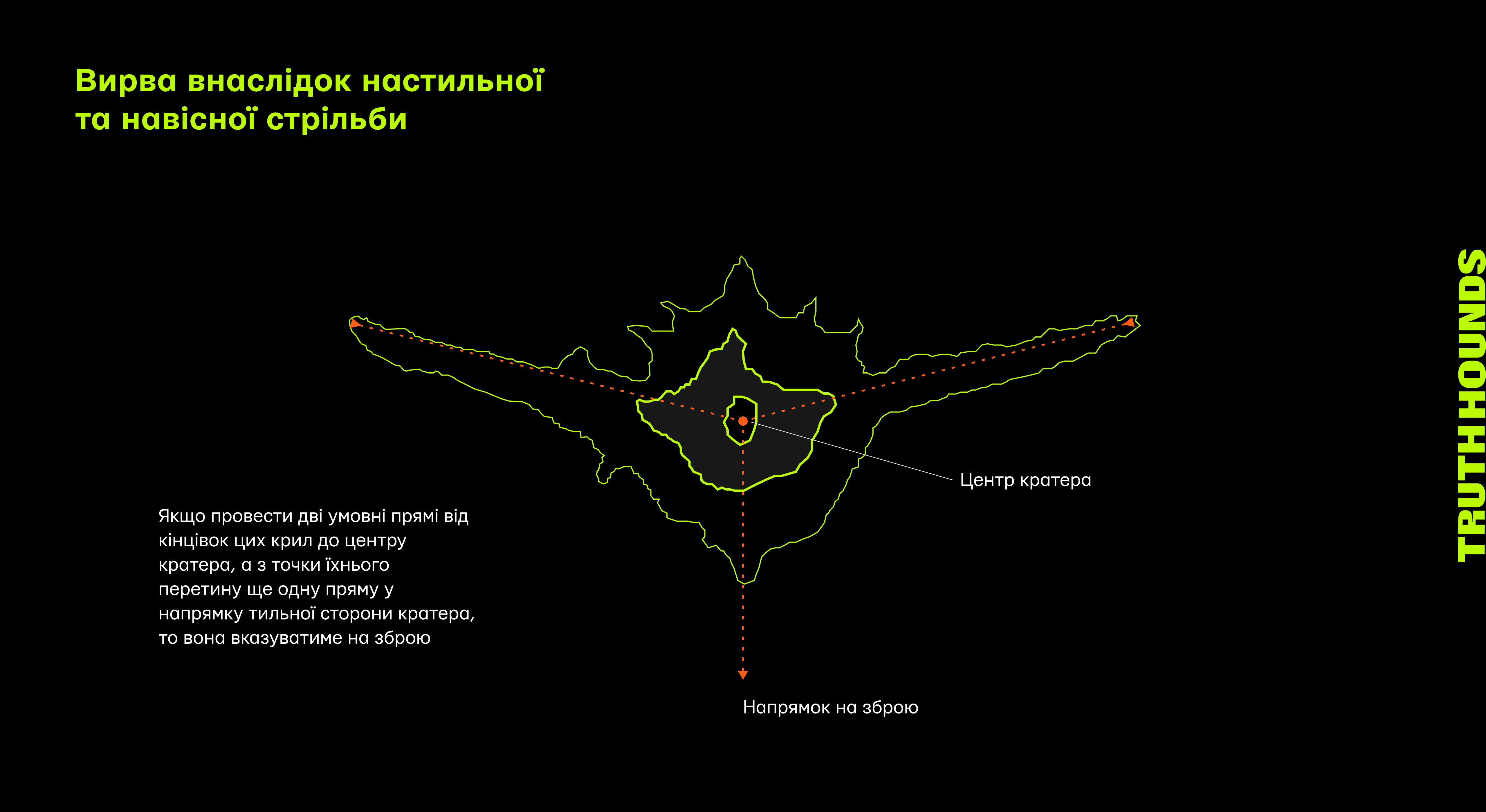 На рисунку 2 схематично зображено залишковий слід, характерний для снарядів, що мали настильну або навісну траєкторію польоту. Така вирва характеризується наявністю двох виражених осколкових крил, що відходять з обох боків від центру кратера у висхідному напрямку відносно нього. Якщо провести дві умовні прямі від кінцівок цих крил до центру кратера, а з точки їх перетину ще одну пряму у напрямку тильної сторони кратера, то вона вказуватиме на зброю.