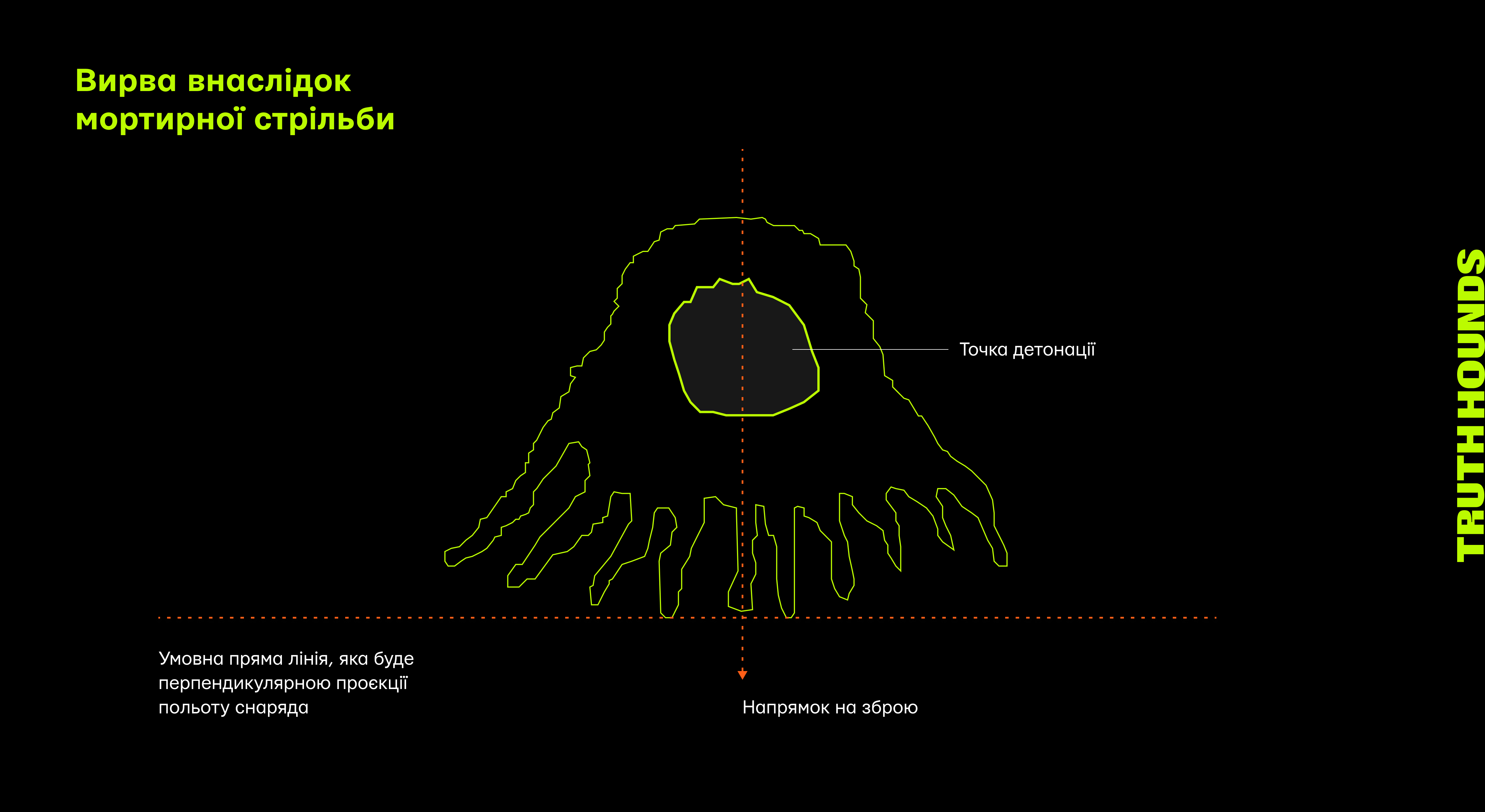 На рисунку 1 схематично зображено залишковий слід від снаряда, що влучив у поверхню внаслідок мортирної стрільби (стрільба при куті піднесення ствола понад 45°). Найчастіше такий слід залишають мінометні міни, адже кут між горизонтальною площиною і напрямком каналу ствола (кут підвищення) у більшості мінометів коливається в межах від 45° до 85°. Варто зауважити, що влучання з деяких типів мінометів можуть мати інший тип залишкового сліду на поверхні. Так, наприклад, кут підвищення в автоматичного 82-мм міномету 2Б9 «Васильок» може змінюватися від 1° до 85°, а отже він може вести настильну (при куті піднесення ствола до 20°) та навісну (при куті піднесення ствола від 20° до 45°) стрільбу.