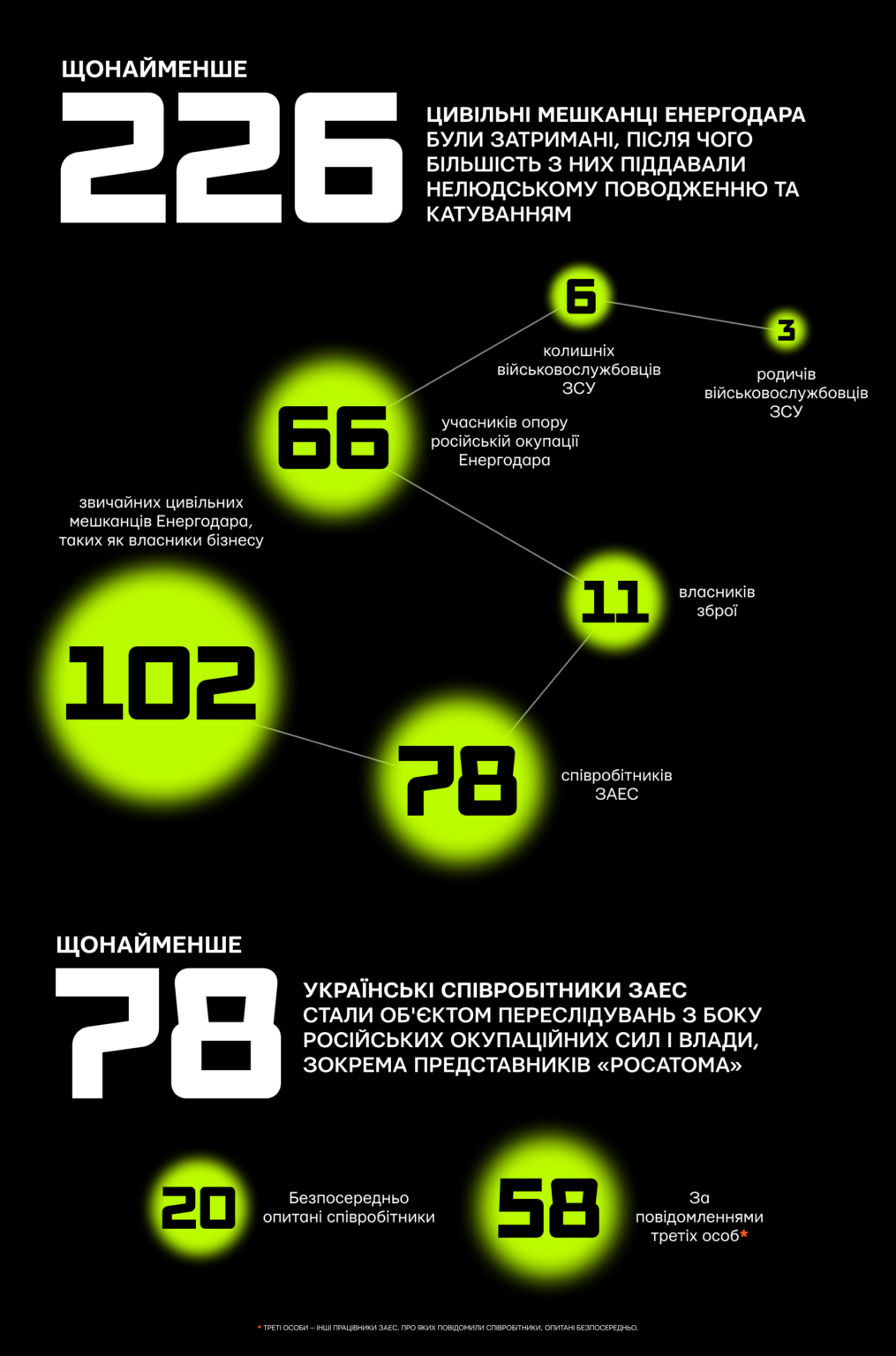 У цьому звіті розглядається фізичне та адміністративне захоплення окупаційними силами Енергодара та ЗАЕС, систематичні катування та переслідування цивільних, зокрема працівників станції, та активна участь російської державної атомної корпорації «Росатом» в управлінні окупованим містом та в перерахованих злочинах. На основі багатомісячного дослідження звіт демонструє, як корпоративні, адміністративні та фінансові структури «Росатома» були перетворені на інструмент військового контролю в Енергодарі та призвели до придушення опору, скоєння серйозних злочинів і порушення ядерної безпеки та захищеності. Висновки звіту підкреслюють нагальну потребу у скоординованих міжнародних діях, щоб зупинити чинні порушення, гарантувати ядерну безпеку та захищеність, а також притягнути винних до відповідальності.