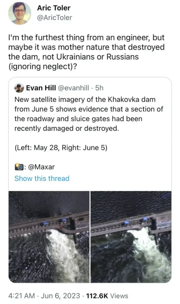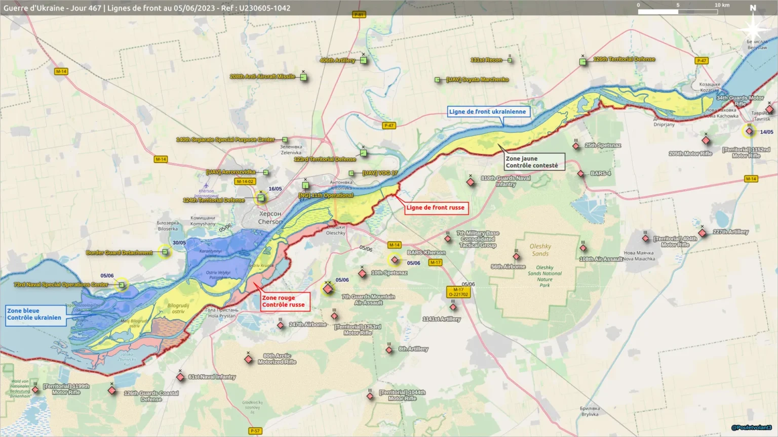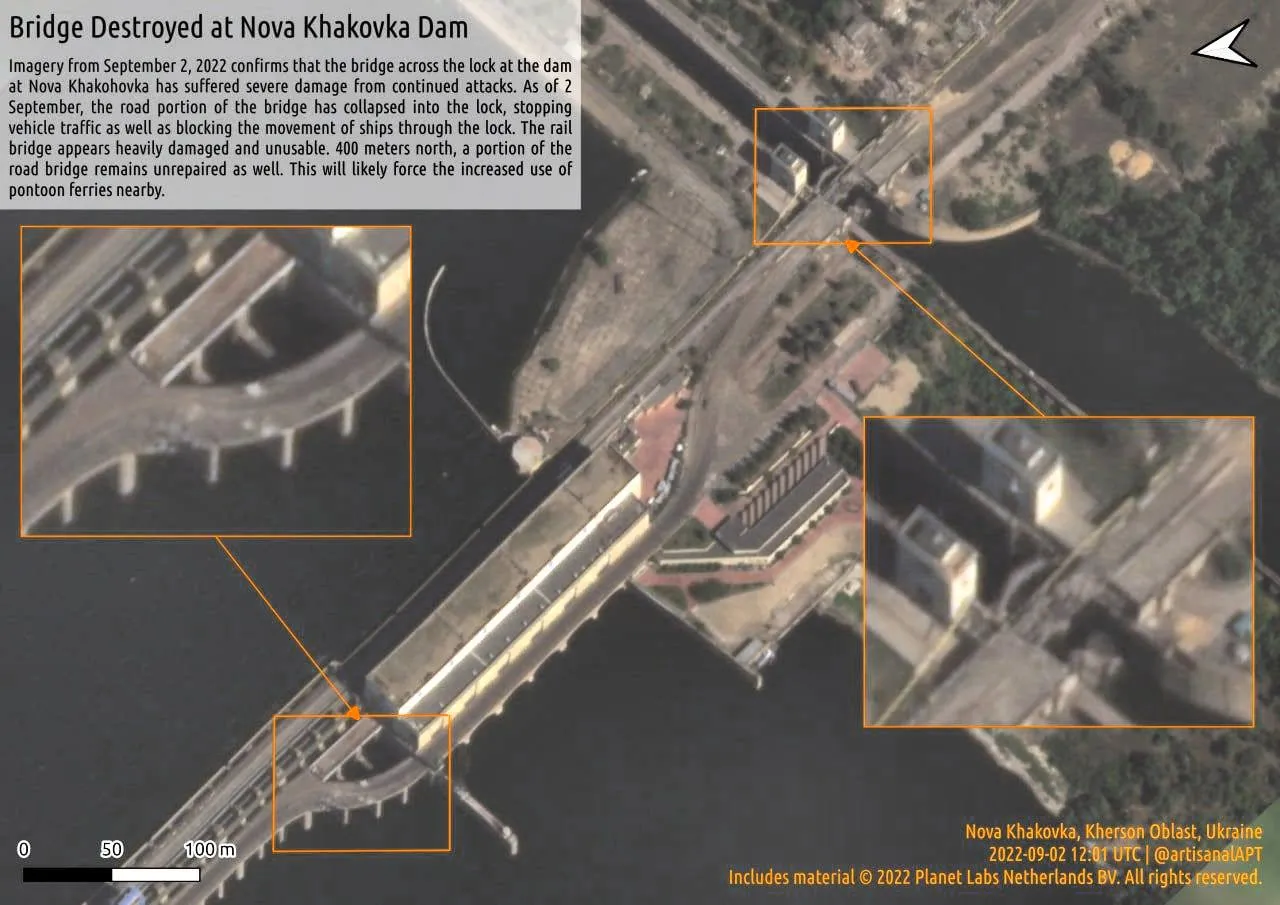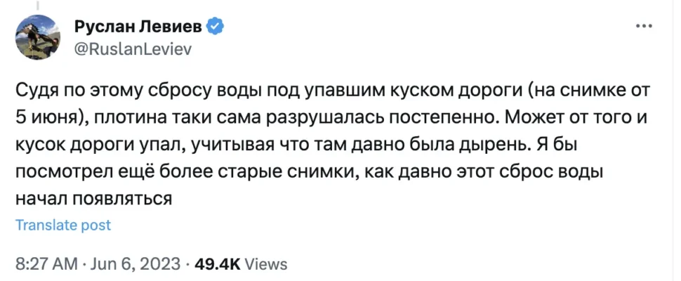 У ніч на 6 червня повідомлення про руйнування греблі Каховської ГЕС з’явилися в російських Telegram-каналах, що швидко привернуло увагу українських та міжнародних ЗМІ. Вранці 6 червня українська влада офіційно оголосила про повне руйнування греблі Каховської ГЕС, заявивши, що відновлення неможливе[70].
