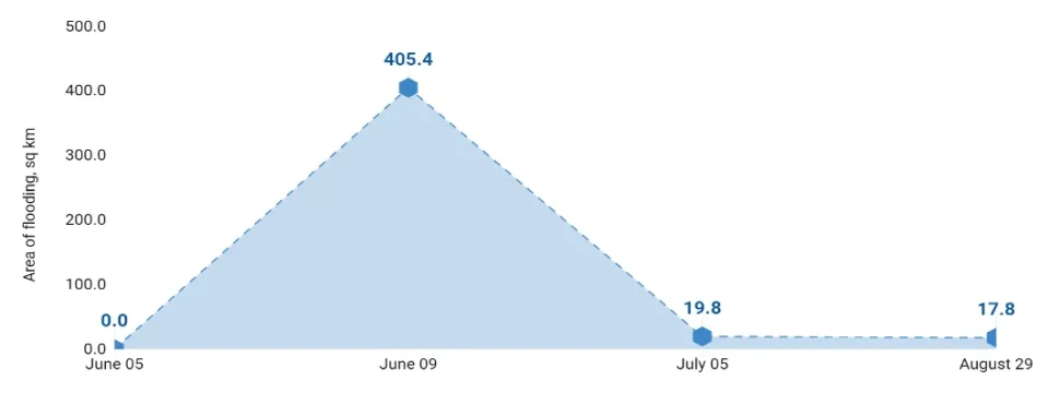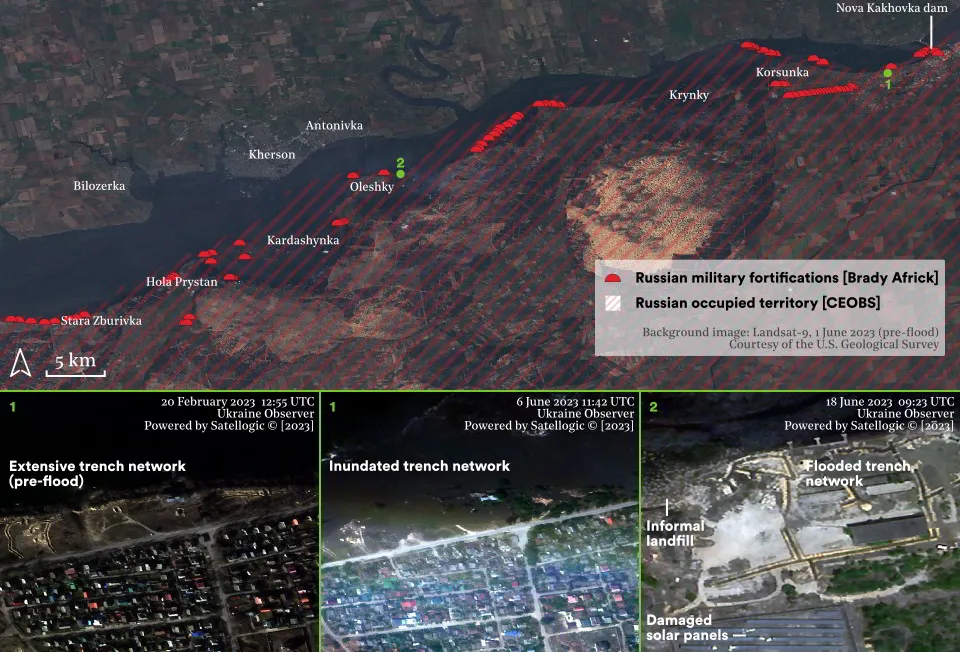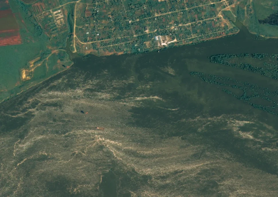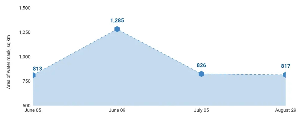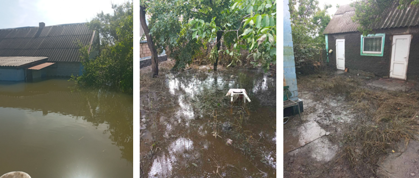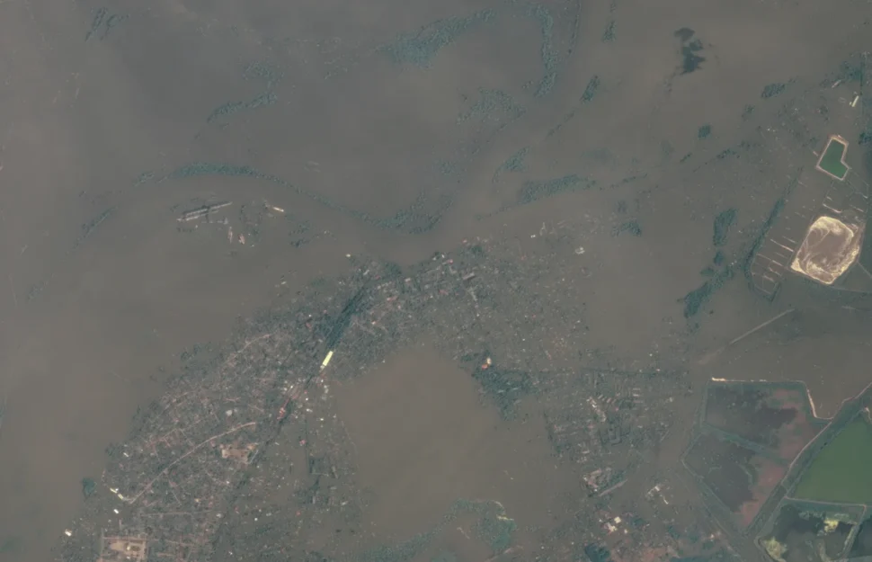 Тим часом українські території, розташовані нижче за течією Дніпра, затоплювала вода, що виливалася з Каховського водосховища через руйнування греблі. До вечора 7 червня місцева влада повідомила, що в Херсоні — найбільшому населеному пункті на шляху води — підтоплено 1802 будівлі[72]. Наступні дані вранці 8 червня показали, що підтоплено 600 квадратних кілометрів Херсонської області, 32% постраждалої території розташовано на правому березі, а 68% — на лівому березі Дніпра[73].