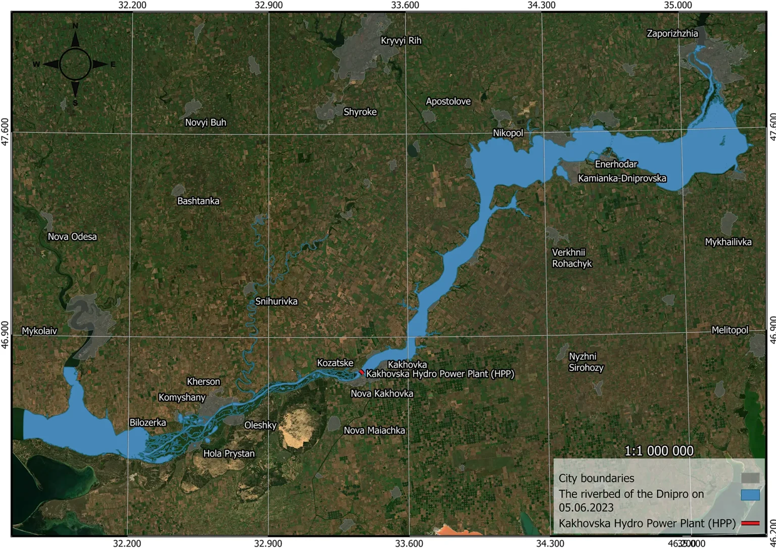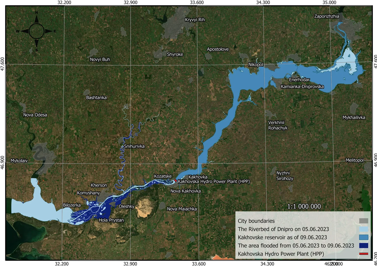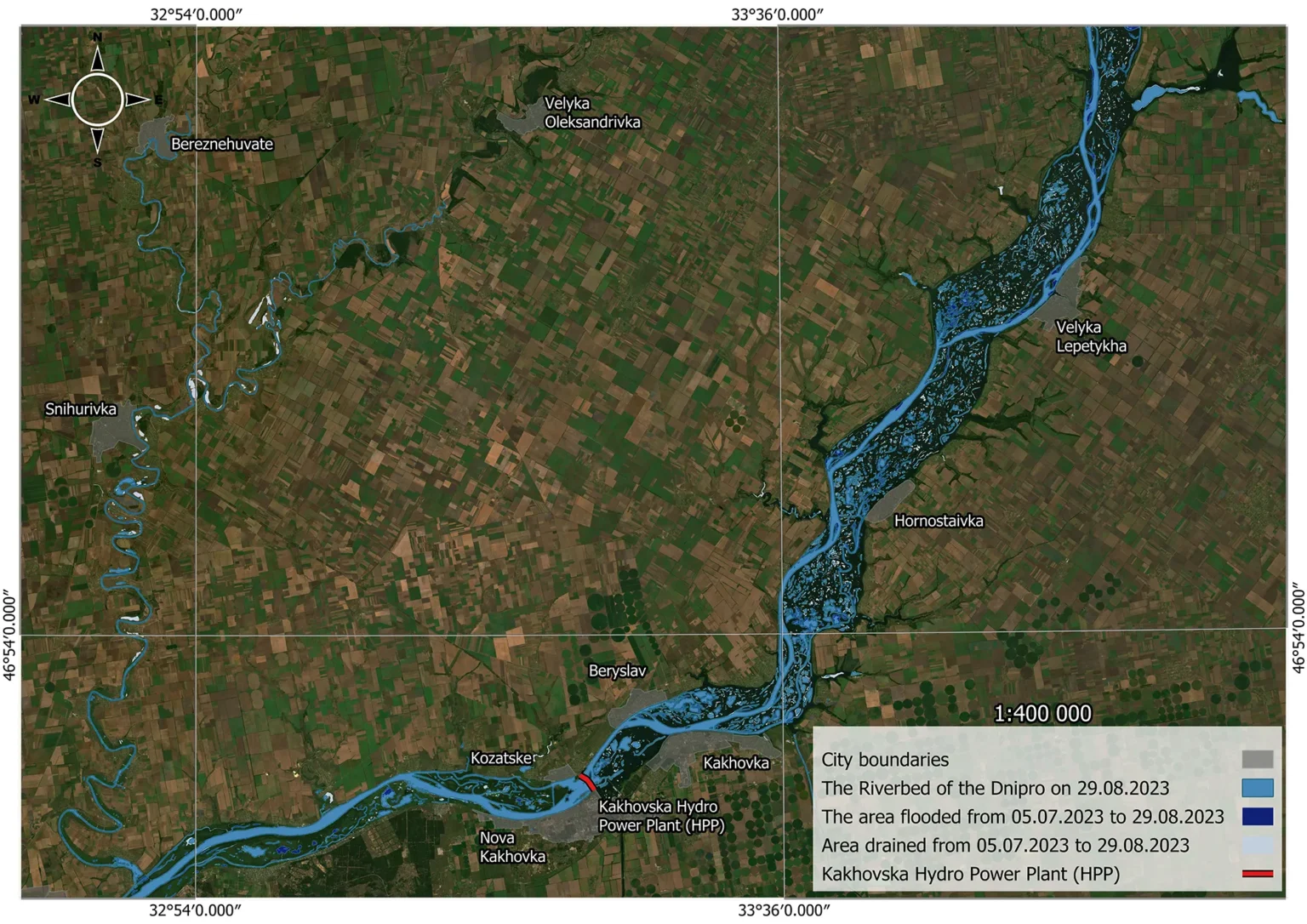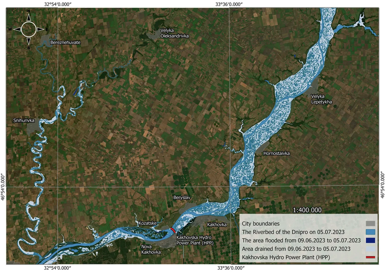 Примітно, що найбільш постраждала територія, лівий берег Дніпра[1], залишається недоступною через російську окупацію. Отже, значна частина цього звіту ґрунтується на даних OSINT (з англ. — розвідка на основі відкритих джерел). Наприклад, OSINT-аналіз сприяв комплексному дослідженню всіх потенційних пояснень руйнування Каховської ГЕС, що дозволило визначити найбільш актуальний причинний фактор. Крім того, ми зібрали супутникові знімки та обробили, створивши базу геоданих руху води внаслідок обвалу Каховської греблі. Цей набір даних представлений у вигляді серії карт у Розділі 3.2. цього Звіту або може бути додатково розглянутий як база даних ГІС[2].
