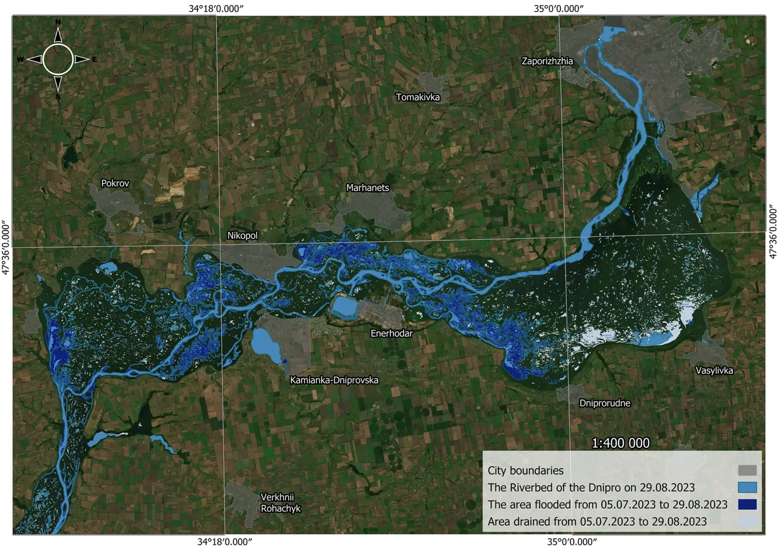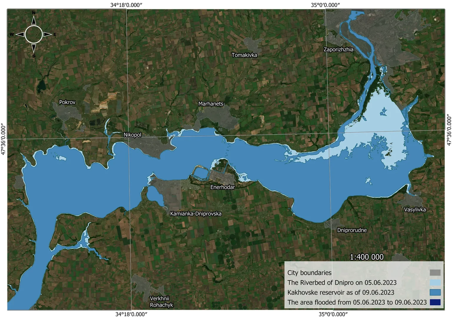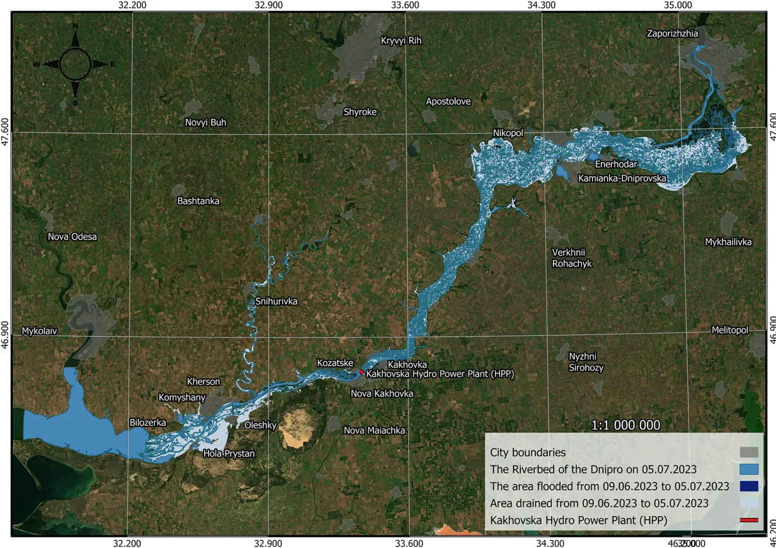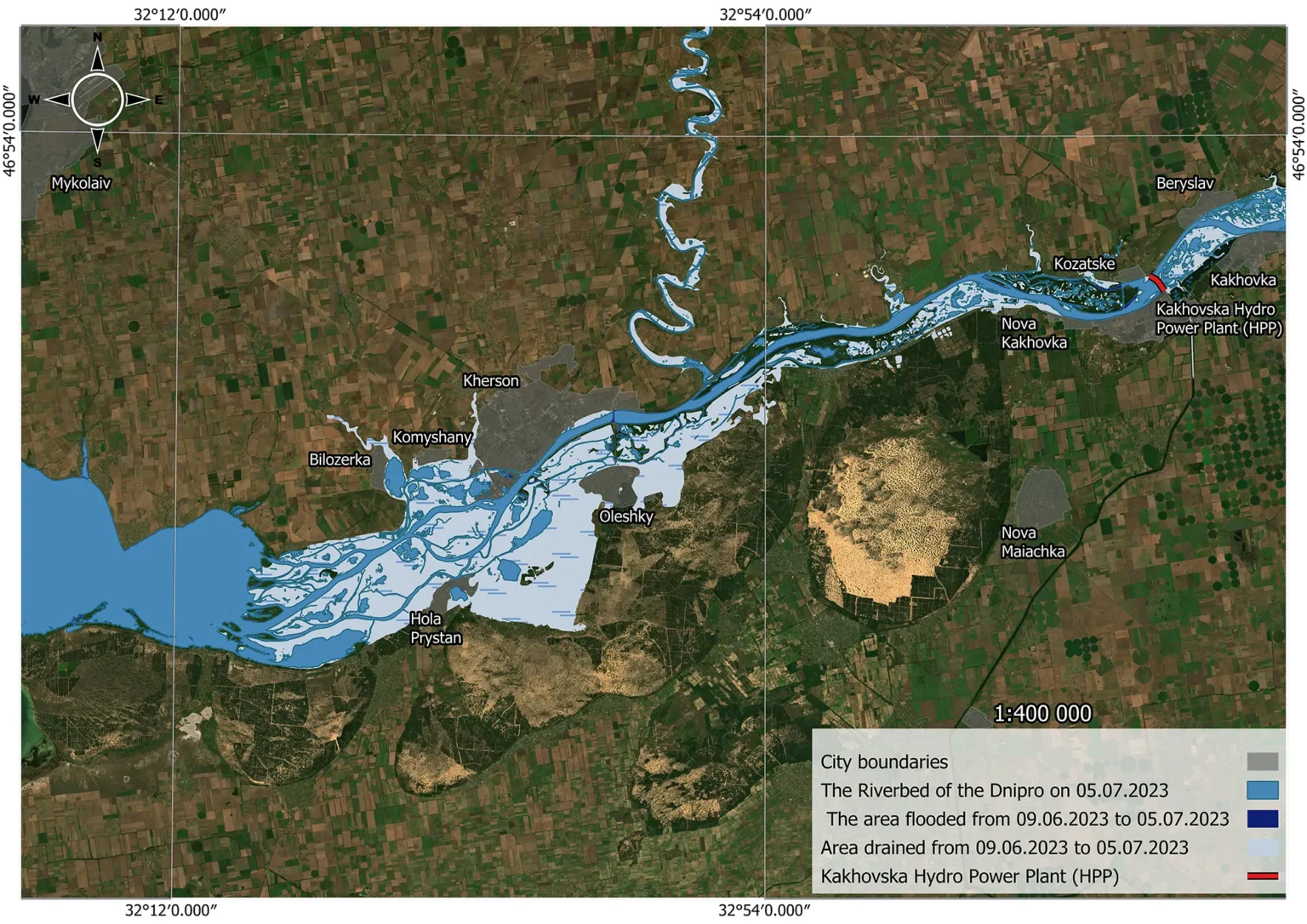 Примітно, що найбільш постраждала територія, лівий берег Дніпра[1], залишається недоступною через російську окупацію. Отже, значна частина цього звіту ґрунтується на даних OSINT (з англ. — розвідка на основі відкритих джерел). Наприклад, OSINT-аналіз сприяв комплексному дослідженню всіх потенційних пояснень руйнування Каховської ГЕС, що дозволило визначити найбільш актуальний причинний фактор. Крім того, ми зібрали супутникові знімки та обробили, створивши базу геоданих руху води внаслідок обвалу Каховської греблі. Цей набір даних представлений у вигляді серії карт у Розділі 3.2. цього Звіту або може бути додатково розглянутий як база даних ГІС[2].