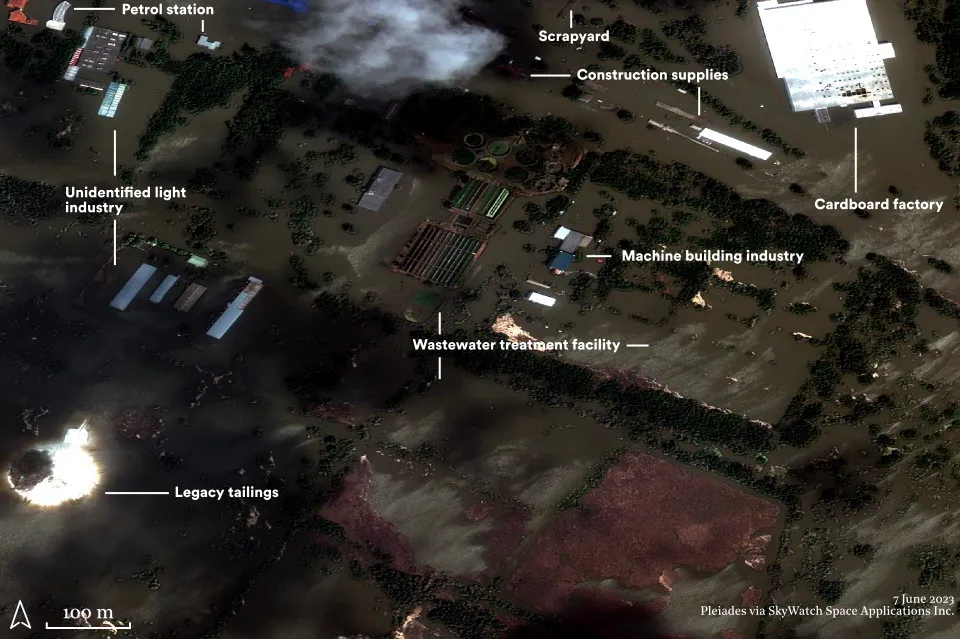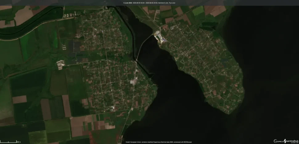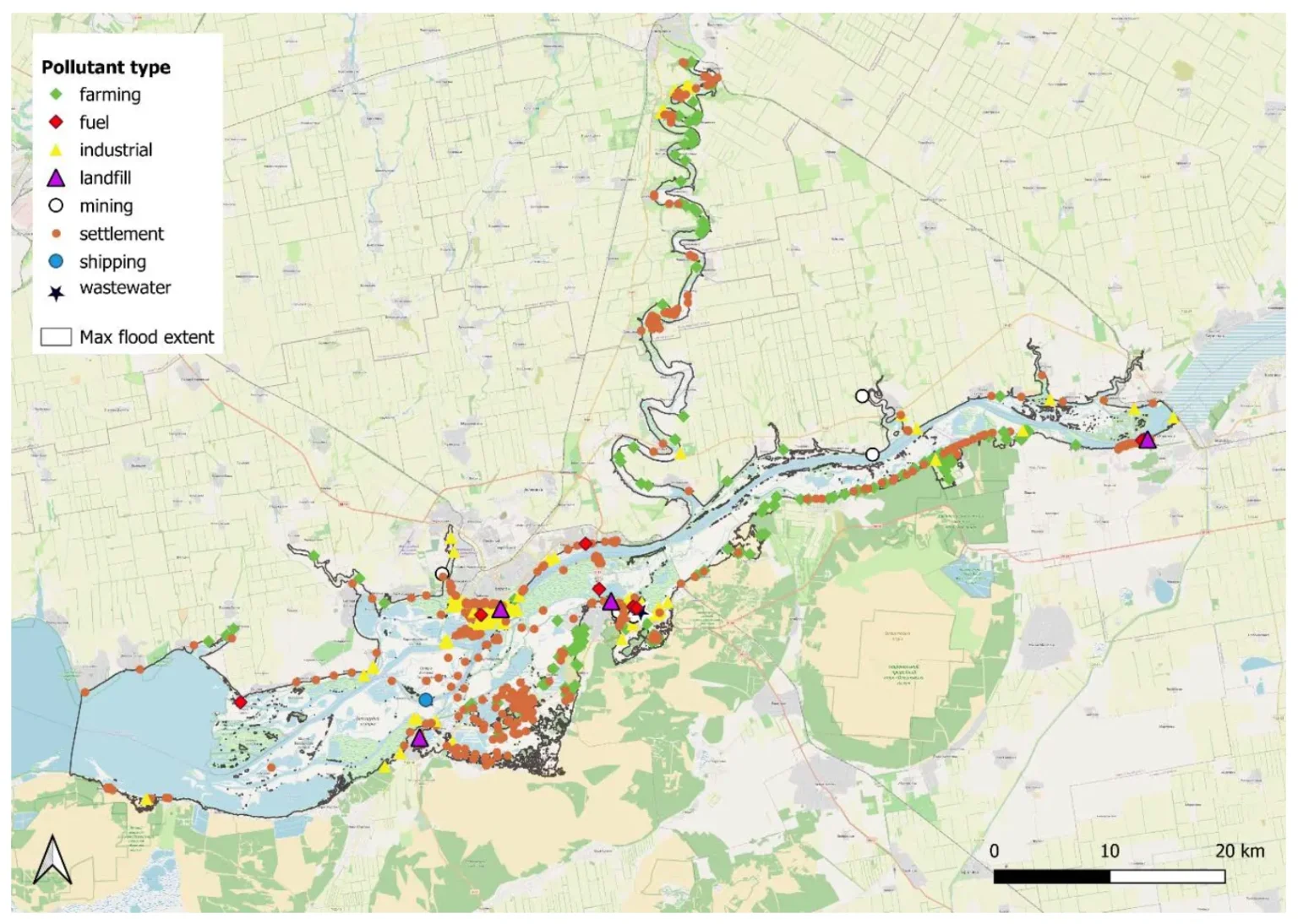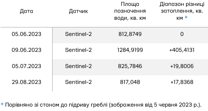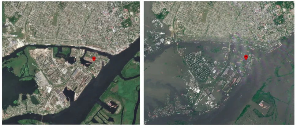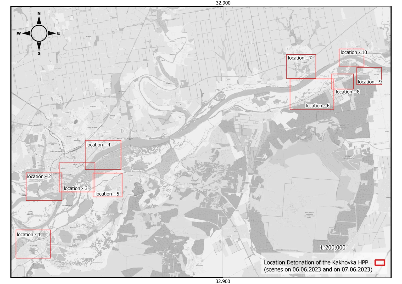 Примітно, що найбільш постраждала територія, лівий берег Дніпра[1], залишається недоступною через російську окупацію. Отже, значна частина цього звіту ґрунтується на даних OSINT (з англ. — розвідка на основі відкритих джерел). Наприклад, OSINT-аналіз сприяв комплексному дослідженню всіх потенційних пояснень руйнування Каховської ГЕС, що дозволило визначити найбільш актуальний причинний фактор. Крім того, ми зібрали супутникові знімки та обробили, створивши базу геоданих руху води внаслідок обвалу Каховської греблі. Цей набір даних представлений у вигляді серії карт у Розділі 3.2. цього Звіту або може бути додатково розглянутий як база даних ГІС[2].