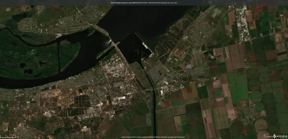 Повномасштабне вторгнення Росії в Україну також відбувалося й з окупованого з 2014 року Кримського півострова. Вранці 24 лютого 2022 року колони російської військової техніки прорвали українські блокпости на Перекопському перешийку та півострові Чонгар. Російські війська стрімко просувалися головними дорогами Херсонщини в бік її найбільших міст. Так, у другій половині дня 24 лютого Херсонська ОДА повідомила про присутність окупаційних військ у всіх п’яти адміністративних районах області. Зокрема, облдержадміністрація заявила онлайн про захоплення контролю над Каховською ГЕС і переправою через Північно-Кримський канал[56]. У той самий день у Міненерго України уточнили, що 24 лютого об 11:28 «невідомі озброєні особи проникли на територію ГЕС», а на греблі «стояли танки без розпізнавальних знаків»[57].