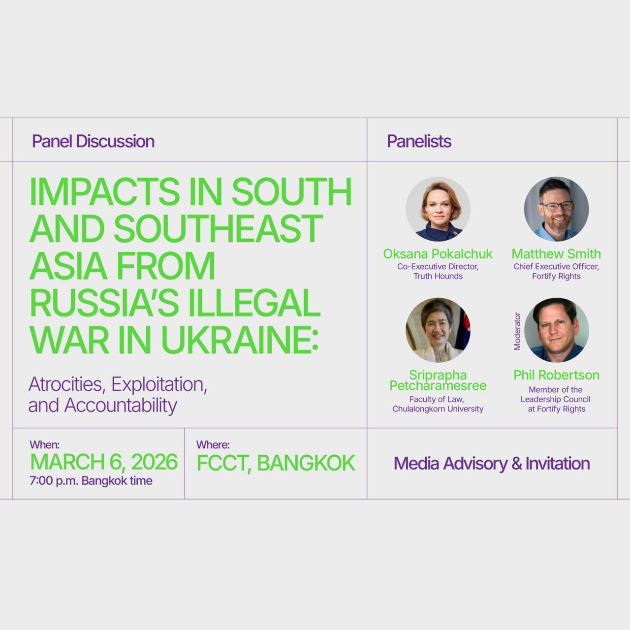 In response to these widening impacts, Truth Hounds, a leading Ukrainian human rights organization documenting atrocity crimes in Ukraine, and Fortify Rights, an international human rights organization working throughout Asia and in Ukraine, will jointly convene a panel discussion.