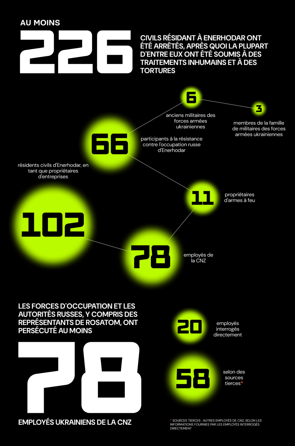 Lorsque les forces russes ont pris Enerhodar le 4 mars 2022, moins de deux semaines après le début de l’invasion à grande échelle de l’Ukraine, elles ont pris le contrôle de la CNZ, la plus grande centrale nucléaire d’Europe. Les troupes russes ont maintenu leur contrôle sur les infrastructures critiques d’Enerhodar, mais les autorités municipales ukrainiennes ont continué à fonctionner, organisant des évacuations, assurant les services publics et soutenant le moral des citoyens. La résistance civile a conduit des milliers de personnes à manifester contre l’occupation. Cet accord fragile s’est effondré fin mars et début avril, lorsque les forces russes ont démantelé les systèmes de gouvernement ukrainiens et les ont remplacés par la force par des organes administratifs parallèles. La répression et la violence sont rapidement devenues systématiques, visant notamment les volontaires de la défense territoriale, les militants pro-ukrainiens et le personnel de la CNZ qui refusait de collaborer. Les forces russes ont établi au moins sept centres de détention à Enerhodar et dans ses environs, dont deux installations de moindre envergure.