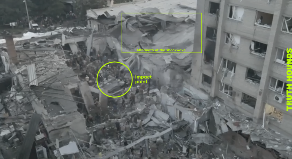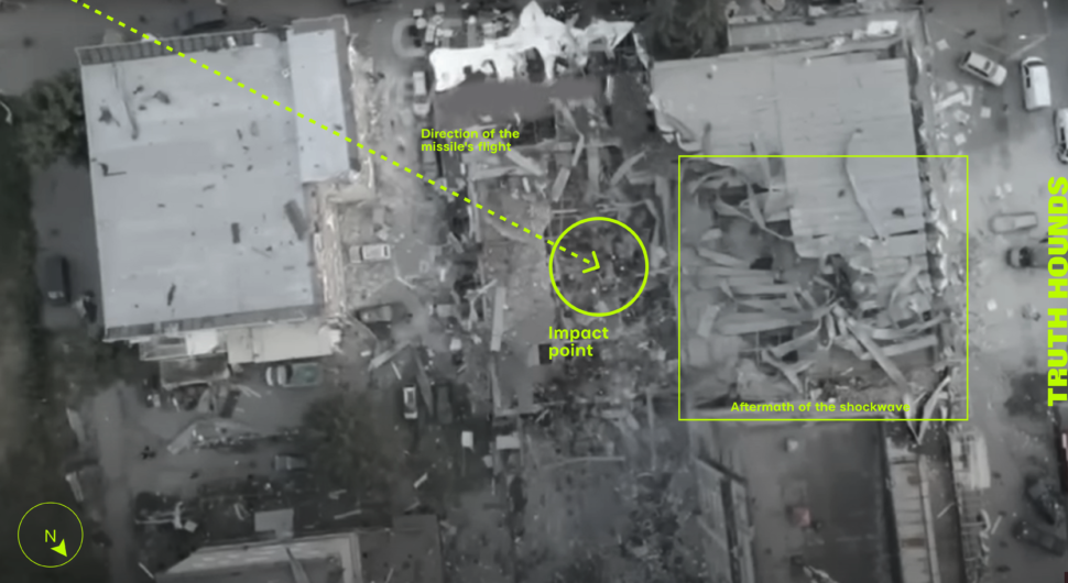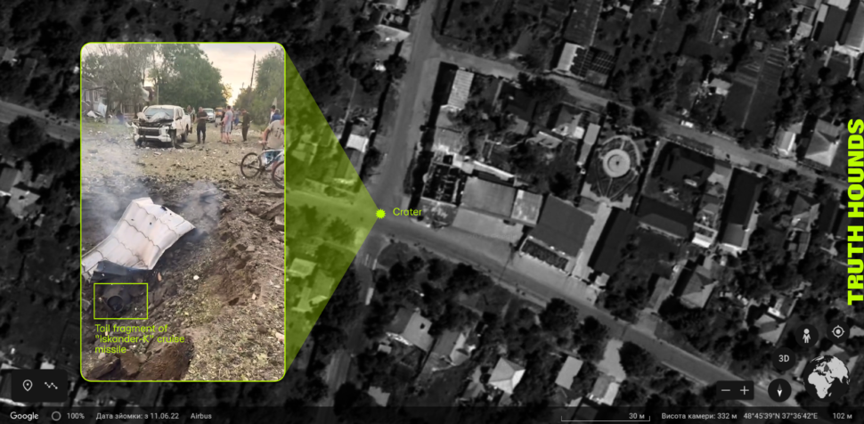 Considering the nature of the damage to the premises of the Ria Lounge in Kramatorsk, the characteristics of the crater in Bilenke and the projectile fragment located therein, statements from eyewitnesses, and other specific characteristics of the attack, Truth Hounds were able to prove that the Russian Armed Forces carried out this attack using Iskander-K cruise missiles.