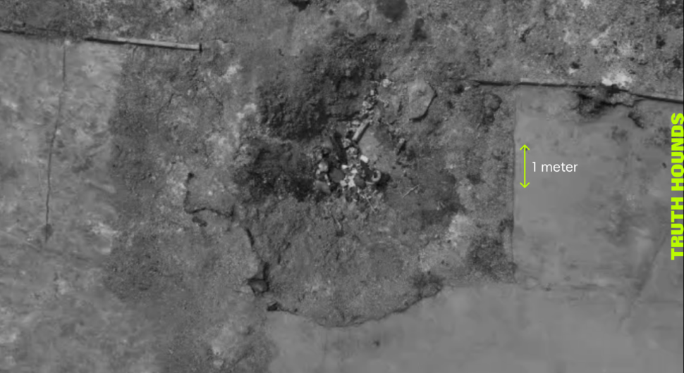 Notably, the workers who repaired the road following the strike laid the new asphalt in such a way that the ‘patch’ essentially followed the contour of the crater itself. Due to this fact, Truth Hounds documenters were able to establish that the crater was oval in shape, with its longer diameter being 5.5 metres.