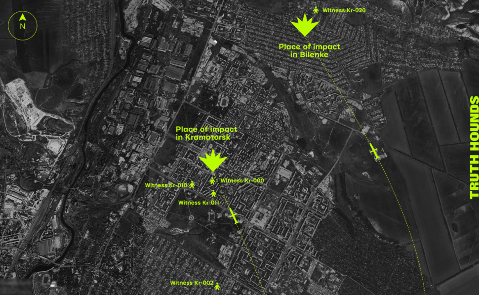 Thus, regarding this component, the testimony of witnesses of the attack on Kramatorsk fully corroborate the testimony related to the attack on Bilenke that was shared with Truth Hounds documenters. Having heard the explosion, one of the witnesses in Kramatorsk went outside to see what was happening. At that moment, he saw the flight of the second missile which struck Bilenke: