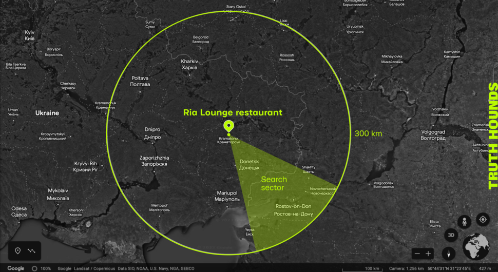 In addition to the information gathered during the field mission and the remote interviewing of eyewitnesses and survivors, Truth Hounds investigators used data from open sources, making use of a variety of tools to search for, identify, and verify said information. In addition, the tactical and technical characteristics of the entire range of missiles used by the Armed Forces of Russia, information about the movement of their units, and satellite images from Planet, Maxar, and Google Earth were also analysed. We also used Paliscope software, which uses artificial intelligence to process large amounts of data, PimEyes facial recognition software, and bots that can find personal information about specific individuals. These tools helped us to establish and confirm the authenticity of the circumstances we identified, determine the type of weapon used, localise the approximate missile launch site, and identify the unit which carried out the attack, as well as the commander who issued the order to attack. In order to establish the type of missile used and the potential location of its launch, we performed mathematical calculations using the parameters of distance, the speed of sound, and the characteristics of the missiles.