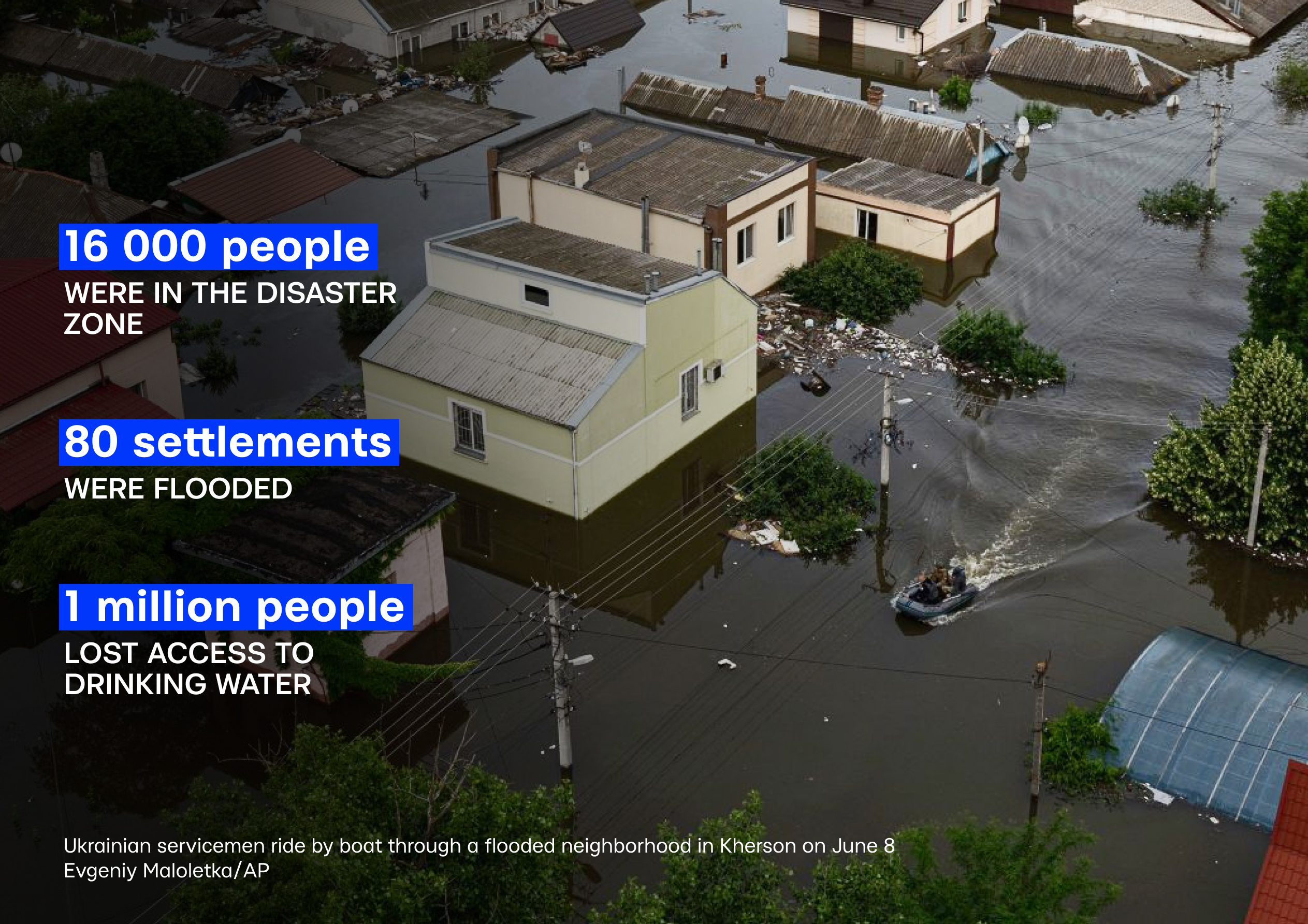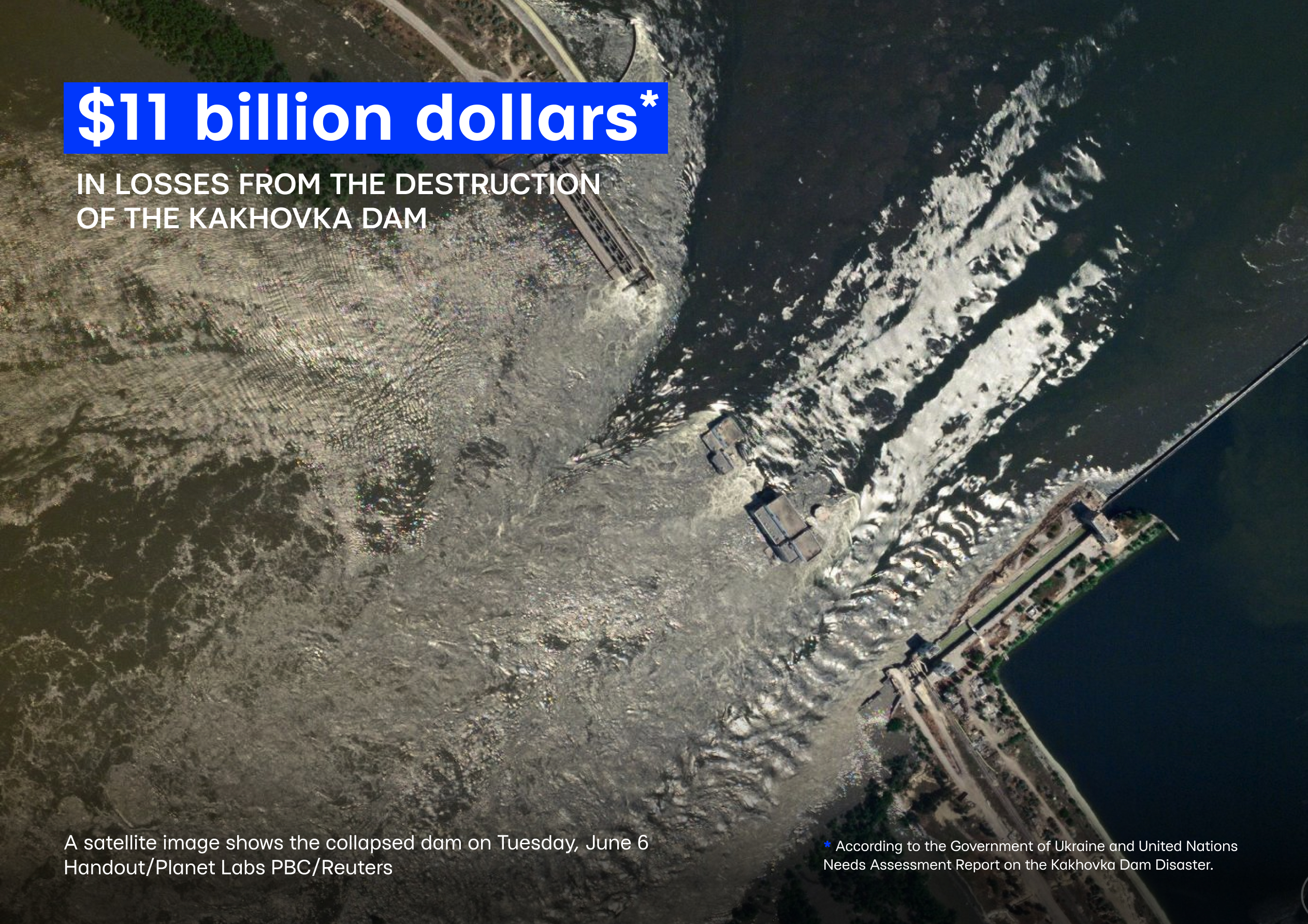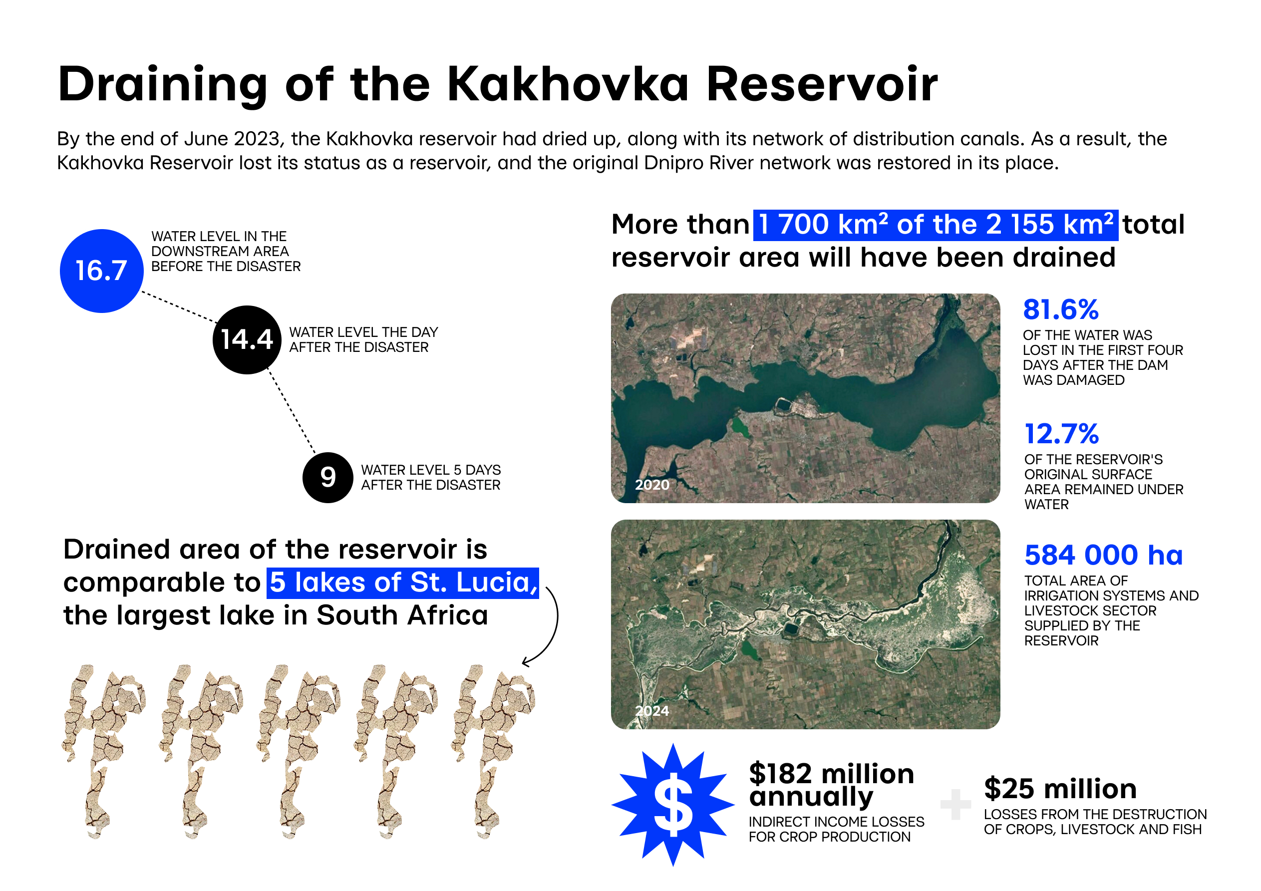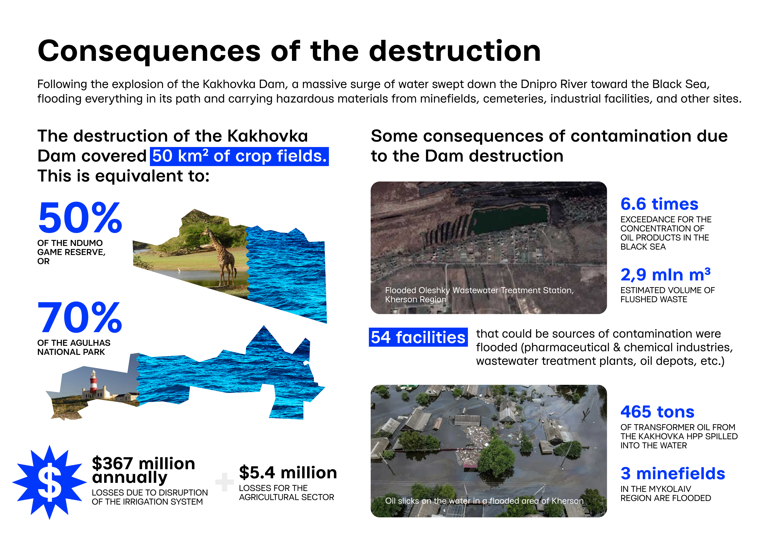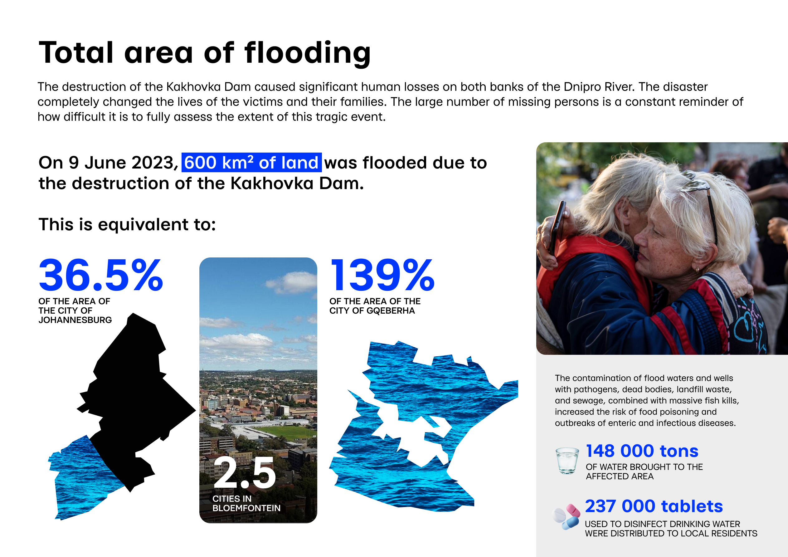 On June 9, 2023, the destruction of the dam caused flooding over 600 km² of land — equivalent to 36.5% of Johannesburg’s area, 2.5 times the size of Bloemfontein, and 139% of Gqeberha’s area.