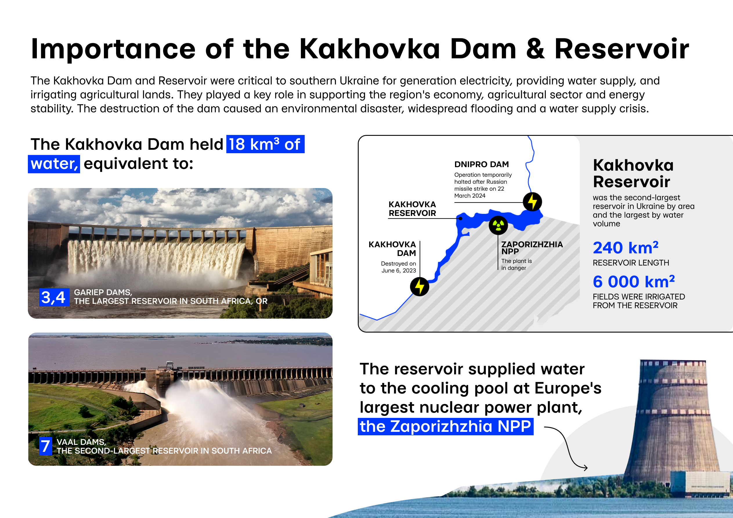 The Kakhovka Dam held 18 km³ of water, equivalent to 3.4 Gariep Dams, the largest reservoir in SA, or 7 Vaal Dams, the second largest reservoir in SA.