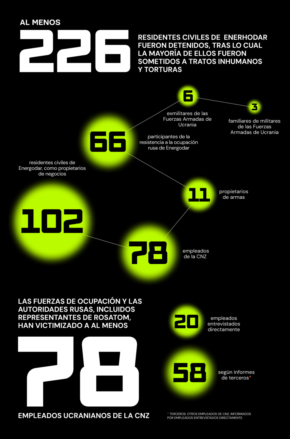 Truth Hounds ha documentado cómo la ocupación rusa detuvo ilegalmente al menos a 226 residentes de Enerhodar y empleados de la central nuclear de Zaporizhzhia, la mayoría de ellos en instalaciones gravemente superpobladas donde los detenidos fueron sometidos a torturas físicas y psicológicas para obtener información, forzar confesiones, castigar la disidencia, intimidar y coaccionar la colaboración. Las fuerzas rusas privaron a los detenidos de comida, agua y atención médica, en contravención de las disposiciones del derecho internacional. La tortura, que incluía palizas, electrocución, violencia sexual, simulacros de ejecuciones y amenazas a los familiares de los detenidos, se convirtió en algo habitual.
