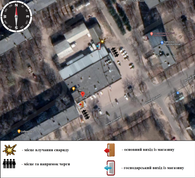 Based on eyewitness testimonies and strike analysis the points of impact during the attack and the strike sequence in the morning of the 16th of March 2022 were determined. On that sunny morning it was rumoured among the residents of Pukhov, Dotsenko and Kosmonavtiv streets that bread would supposedly be brought to Soyuz shop and would be handed out starting from 10 am. None of the witnesses could recall where these rumours came from. People were phoning each other and spreading this news. For this reason, people began assembling next to the abovementioned shop as early as 7.30 am. They took their children or their elderly parents with them in order to get more bread, since at that point in time the city was almost completely without power, the shops stood empty. In that situation a family could certainly use an additional loaf of bread. Gradually two queues formed, one comprising approximately forty persons, next to the shop`s main entrance. The other queue consisted of approximately 50 persons, who were actually waiting for bread and were standing next to the east wall of the same shop (see the image below). A quote by the witness KI-01: