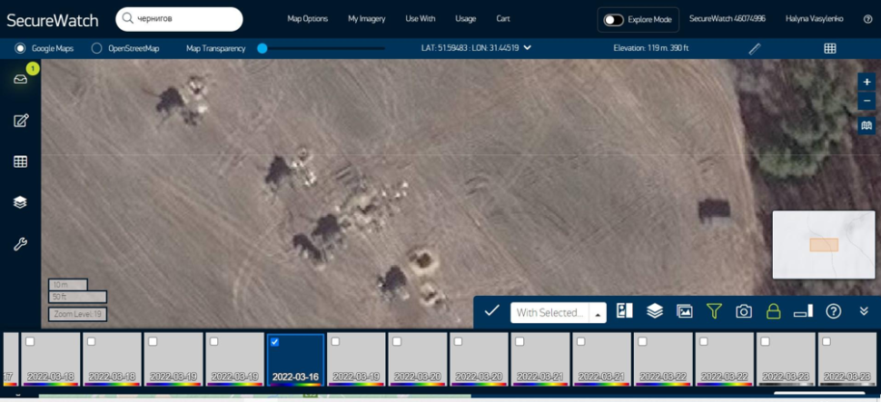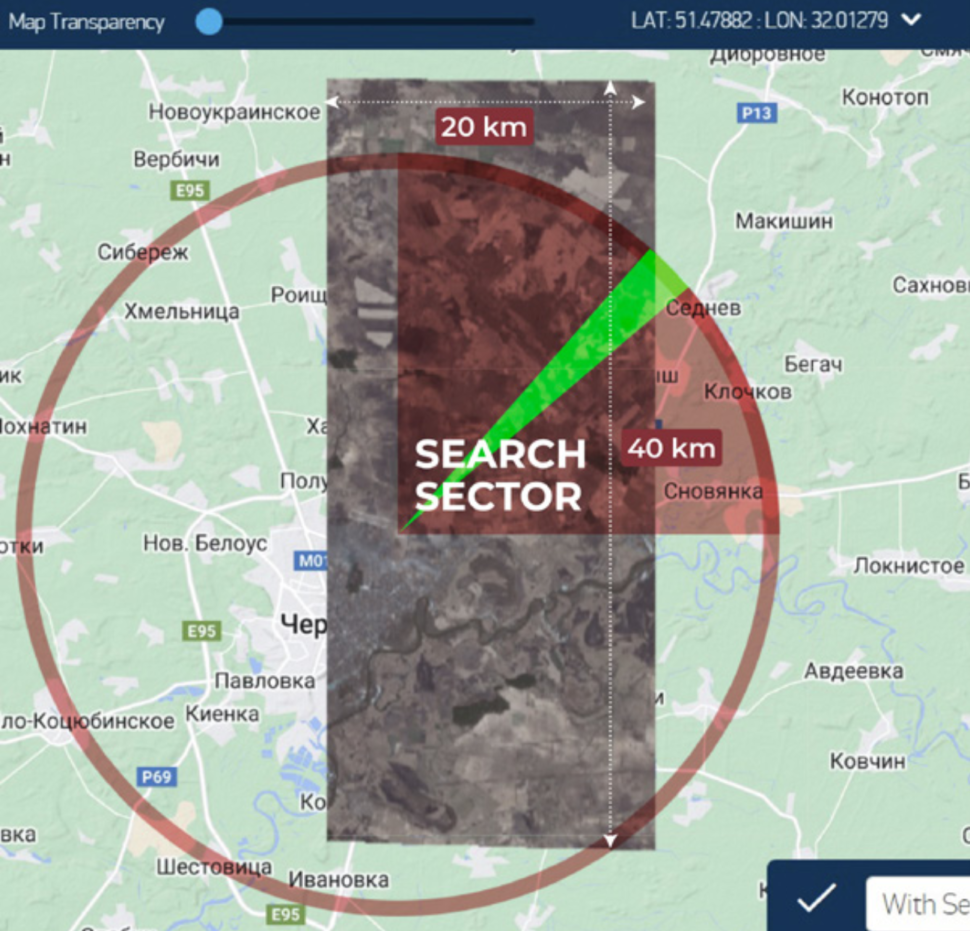 Having determined the origin of fire (and azimuth for howitzer shells) and knowing the characteristics of the weapon used, first and foremost maximum range capability of the projectiles, Truth Hounds analysts have analysed satellite imagery from the sector located to the northeast from Chernihiv and have geolocated the possible firing positions. The only satellite image covering the sector of search dated March 16,2022 was selected for examination. The analysts limited its radius to primarily north-east quadrant, as well as to minimum and maximum projectile range capabilities, listed in section 3 above. A subsector with the established artillery shell approach azimuth was distinguished separately. Unfortunately, the satellite image does not cover all possible search areas, so the analysts studied only the part thereof, available for intelligence.