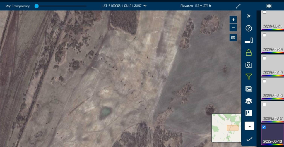 ‣ 11 military equipment pieces in the field next to the forest to the south of the previous positions, with the coordinates 51.59571, 31.44649.