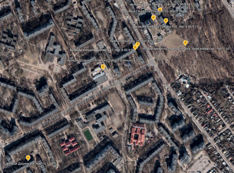 Overall, on March 16, 2022 between 8.50 am and 9.15 am the Truth Hounds documentators have located 12 impact sites of the munitions covering the area of approximately 75 000 square metres (7.5 hectares) on Dotsenko and General Pukhov streets