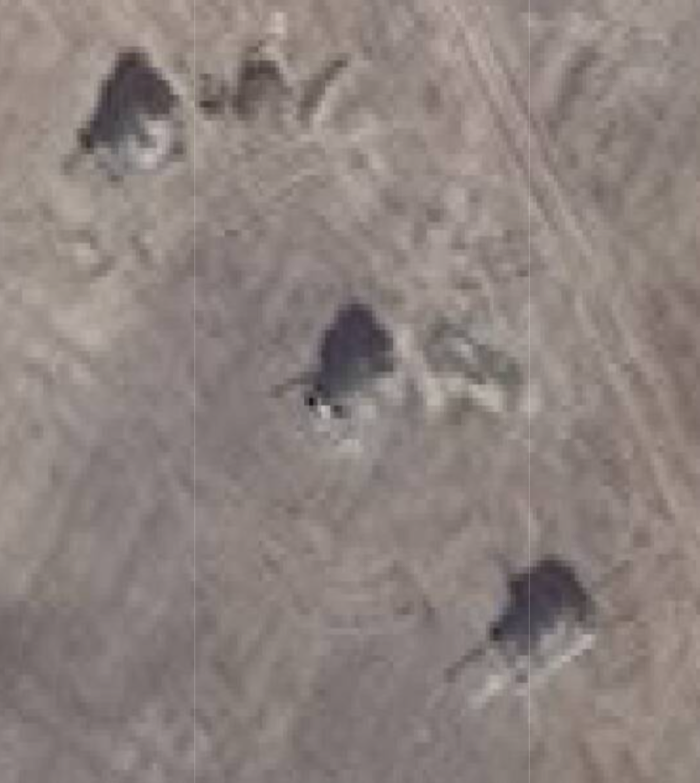 When zooming in on the image, the hardware type can be identified. For instance, howitzers of both types – self-propelled MSTA-S and towed MSTA-B – are well visible in both locations. This is indicated by clear barrel contours and special features of the hardware appearance – one can guess self-propelled artillery pieces by the size and barely visible track chassis, whereas towed pieces can be recognised because they are flanked by trenches.