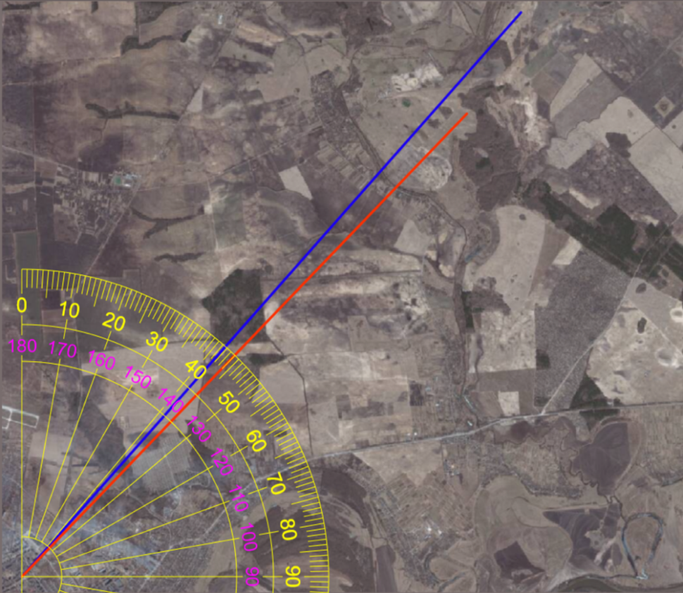 Truth Hounds analysts plotted the flight paths of shells of the howitzers, identified in the field, connecting their coordinates with the point of impact near Soyuz shop coordinates with straight lines. Then they contrasted these flight paths with the known firing azimuth. As a result, it turned out that the flight paths fall within the predetermined azimuth (see the image below). One can therefore claim that the projectile was launched by one of the howitzers, that was located in the field with the coordinates mentioned above.