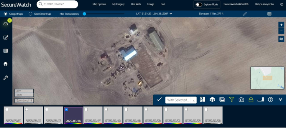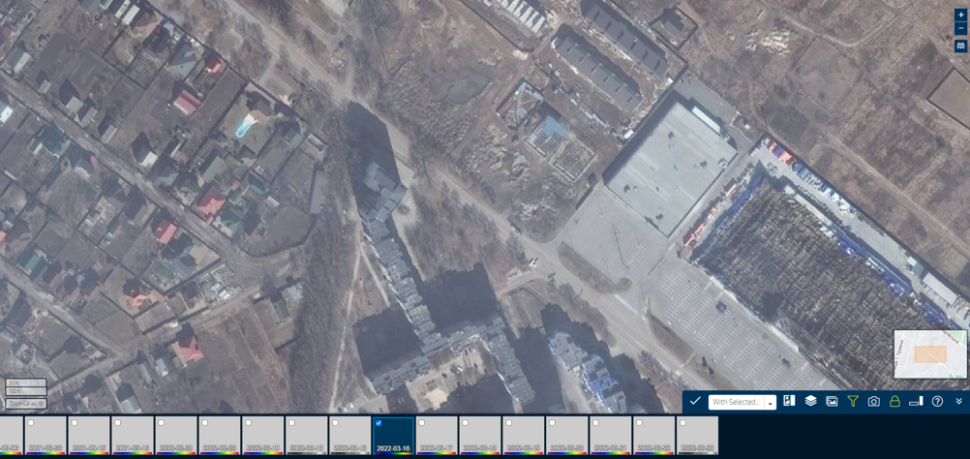 Satellite imagery augmented witness` accounts with additional information: first, by illustrating that the caterpillar track traces, recorded by the documentators, appeared in Berezovyi Hai back on February 28. Second, by establishing that no other tracks appeared there since then until March 16 inclusive. Likewise, a thorough examination of the nearby areas located in the vicinity of Berezovyi Hai, depicted in the satellite image taken on March 16,2022 did not establish the presence of the any military equipment tracks.
