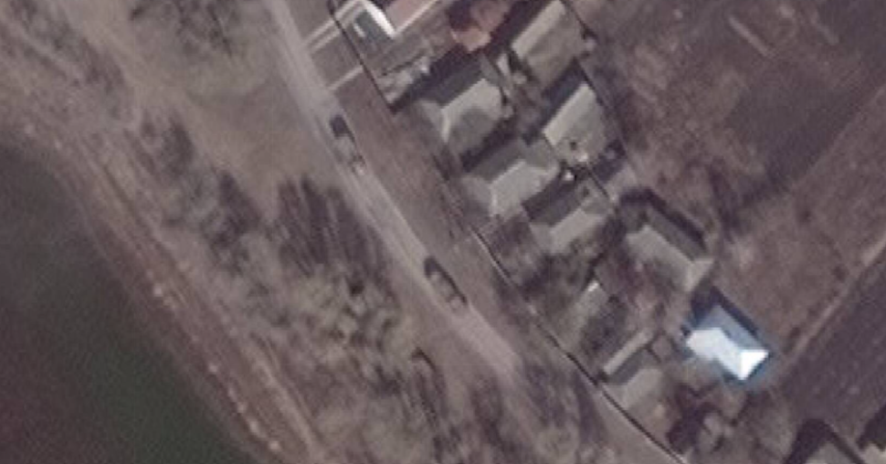 Satellite images dated 19.03.2022 support the eyewitness account of the movement and location of the Russian military equipment in the centre of the village and next to the lake. They show two pieces of the equipment resembling military trucks. These are usually used for personnel, ammunition and food transportation. Multiple launch rocket systems like Grad can also be transported in similar bodies.