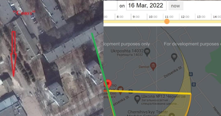 The official investigators and certain media claim that the round hit the queue waiting for bread next to Souyz no.9 shop at 10 am on March,16. However, Truth Hounds have every reason to believe that the attack took place at least on hour earlier. First, two out of four immediate witnesses of the event simultaneously testify that 9 am is the time the queue was attacked, as well as the massive shelling of the area began. Two other witnesses are doubtful about the time. Another indirect evidence pointing that the events began before 10 am is the satellite image of the incident site taken that day. Traces of round burst and possibly the bodies of the deceased are visible in the impact site in the premises of Soyuz shop. The attack, therefore, had already happened. If one juxtaposes the shadows of the objects during this sunny day with the data from SunCalc – a website showing sun position in a certain place, date and time, one can see that the satellite image was taken on March 16 at approximately 11.10 am local time, i.e., one hour after the strike, as determined by the investigators. We do not see in the image, however, any smoke in the places of fires, caused when the rocket hit, for example, the flats located in the 132 and 134 General Pukhov street and 25 Dotsenko street. It`s unlikely that extinguishing fires required so little time, taking into account how long it takes for a fire engine with the fire fighters to arrive.