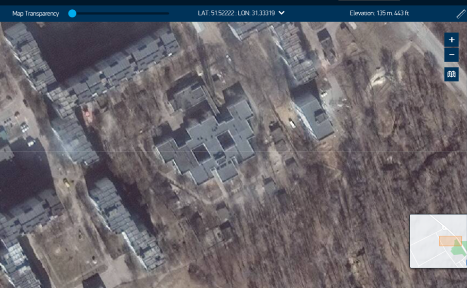 The territorial defence was quartered in the kindergarten in this area (51°31'17.8"N 31°19'51.3"E). I didn`t see how many they were. But I was on the premises. I went there to get water. There were minibuses standing. I didn`t see any combat equipment.