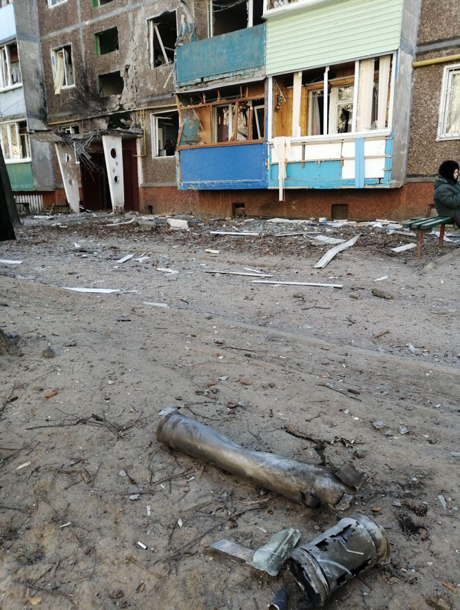 Witness testimonies contain a rather accurate description of munition fragments, found in the shell-holes or apertures in buildings after impact. The witnesses describe these objects as “a half-cylinder-shaped object that has the same colour as duralumin, approximately 30 cm in length, with the 12-15 cm diameter” or “the splinter of the silver cylinder-shaped projectile, approximately 50 cm in length, 120 mm in diameter”. The witnesses recorded, inter alia, such splinters in impact sites on 25 Dotsenko street, and in the courtyard of 132 Pukhov street. The eyewitnesses also note small intervals between the explosions, flashing of the rounds in the sky, as well as the density of “incoming rounds”. All of this points to the use of Grad multiple launch rocket systems during this attack. If one compares the photo of the round splinter, photographed by the witness on impact site on 8 Dotsenko street and the photo of MLRS Grad rockets from other sources, one can see that the very configuration of these rockets, their calibre, tail section, material and coating colour are to all intents and purposes identical.
